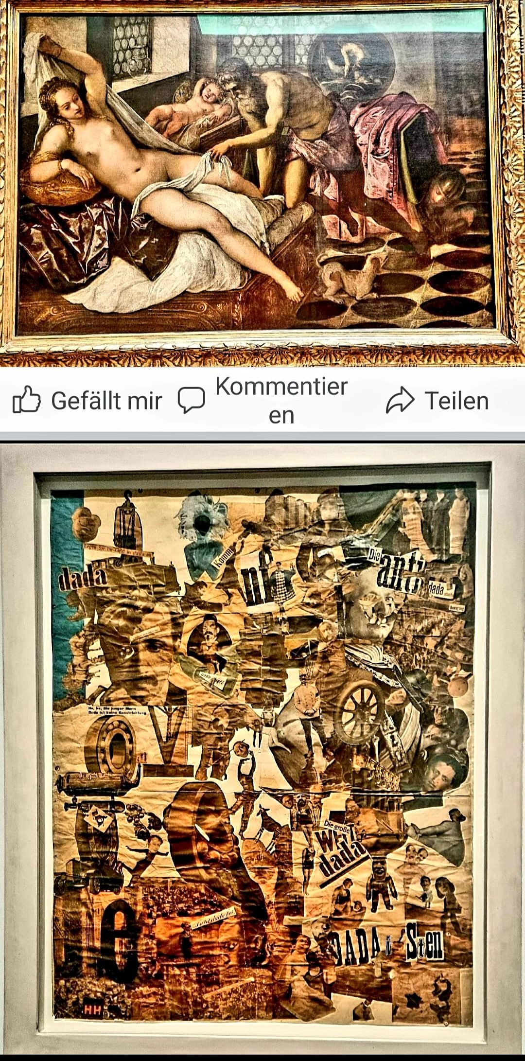 Am 31.5. kann man die Todestage von 2 sehr unterschiedlichen, aber in den Farben harmonierenden Künstlern begehen: der 1. ist der von JACOPO TINTORETTO (1518-1594), der Vater des Domenico Tintoretto. Sein Bild „Vulkan überrascht Venus und Mars“ hängt in München Alte Pinakothek . In Berlin, Neue Nationalgalerie , sah ich dagegen HANNAH HÖCHS (1889-1978) dadaistisches Bild mit einem superlangen Titel (Schnitt mit dem Küchenmesser Dada durch die letzte Weimarer Bierbauchkulturepoche Deutschlands) . Diese vielseitige Künstlerin hat heute ihren 45. Todestag.