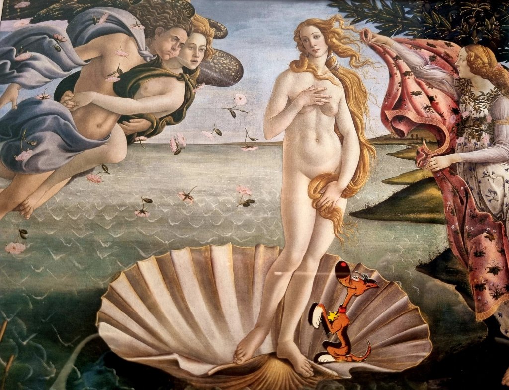 „Hab dich lieb“ heißt die Variante von Botticellis Venus mit dem süßen Rantanplan in der Muschel (Lucky Luke-Fans werden ihn kennen) – eine der wundervollen Collagen von CHRISTIANE KÖHNE, von denen noch einige in der Galerie Torfhaus, Westfalenpark NUR NOCH HEUTE (-18h) zu sehen sind.