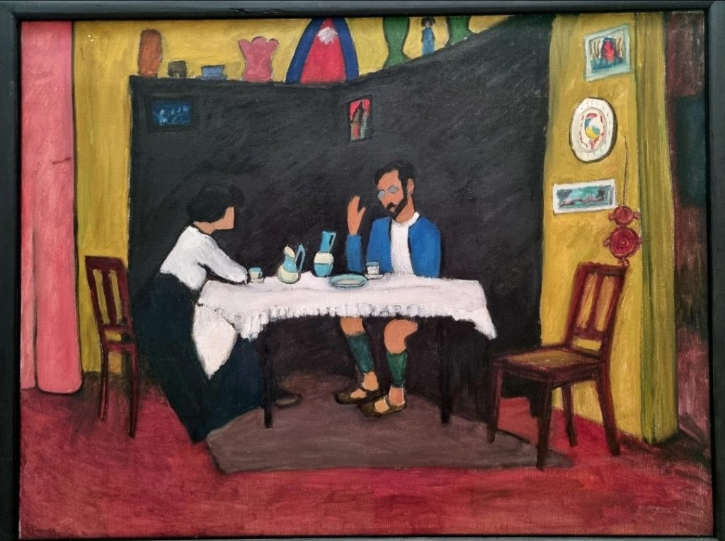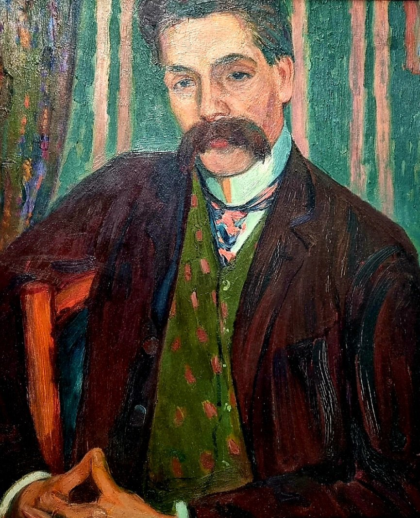 ERMA BOSSI (1875-1952), die heute Geburtstag hätte und zur Expressionistengruppe um JAWLENSKY, KANDINSKY und Co in München gehörte (geboren in Pola im heutigen Kroatien und in Triest ausgebildet), entdeckte ich im Februar im Lenbachhaus und Kunstbau München – zunächst in einem Gemälde als Portraitierte (von GABRIELE MÜNTER) und dann mit ihrem eigenen Gemälde dieses hübschen Bartträgers in schönen Grüntönen und mit Merkelraute😉