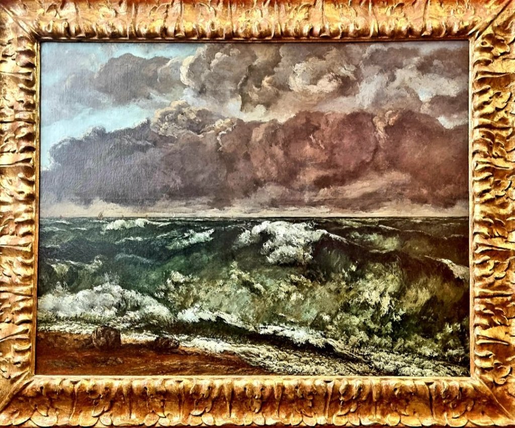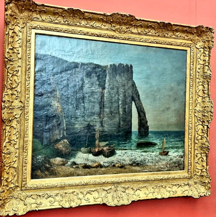 Heute hätte GUSTAVE COURBET (1819-1877) Geburtstag, der große französische Realist. In französischen Museen wie dem Musée d’Orsay habe ich immer mehr seine figürlichen Bilder bewundert (wie l’Origine du Monde oder sein keckes Selbstportrait mit Hund). Im letzten Jahr fielen mir seine Landschaftsbilder auf wie hier eine Variante der „Welle“ (1870) und der „Felsen von Etretat“ (1869), die ich nach einem Normandiebesuch in den 1980ern selbst malte. So schön ist die Landschaft dort. Und diese Schönheit zeigte Courbet ganz pur. (Gesehen in der Alten Nationalgalerie Berlin im März)