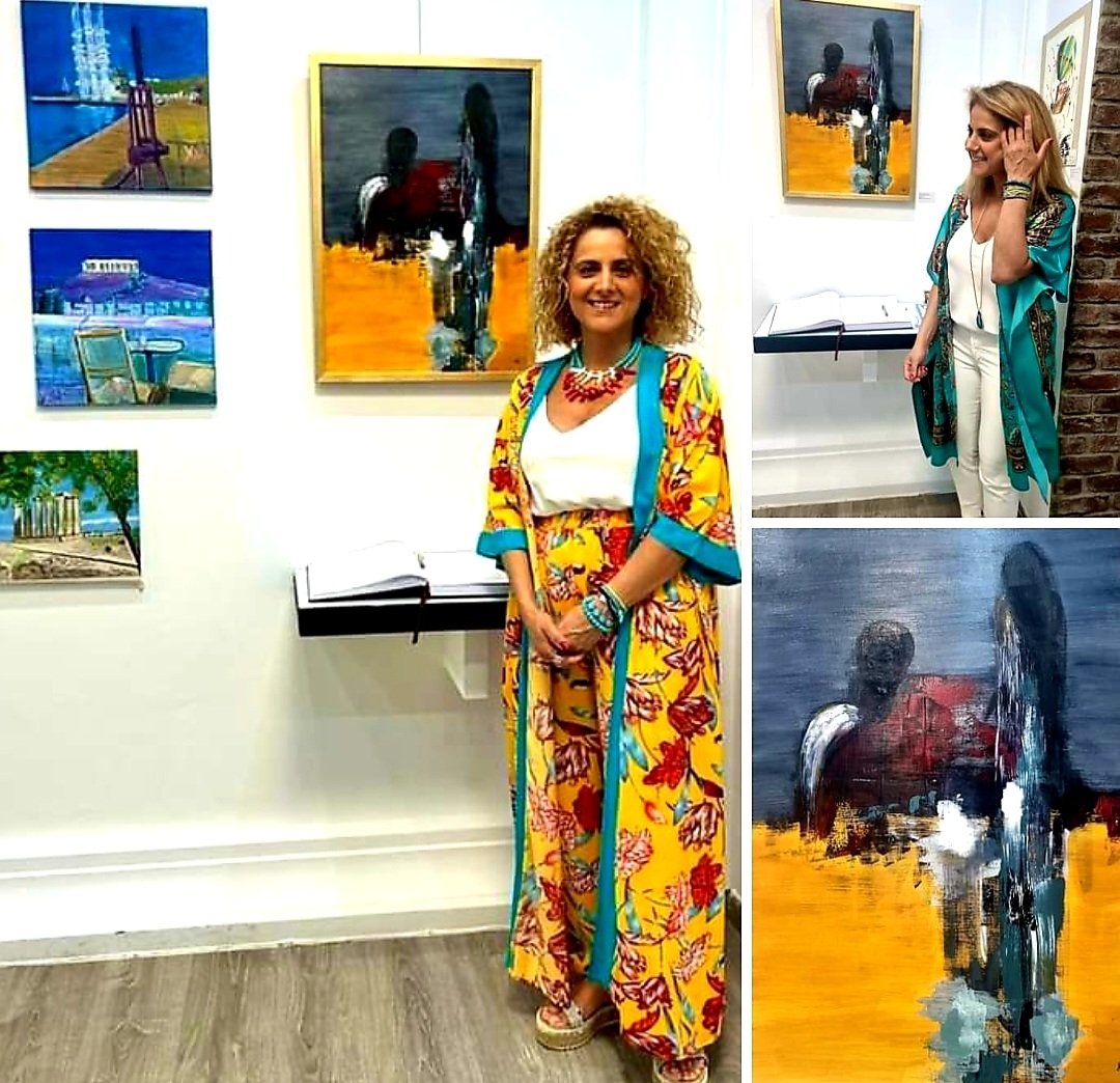 what I loved especially @ ART COM EXPO Thessaloniki (organized by Baronesa Jiselda Salbu) : the Greek artist Maria Sarvanidou with her painting „Together in the Dark“ between abstract and figurative painting – simply beautiful with beautiful colours (hanging next to my two Greece paintings)
