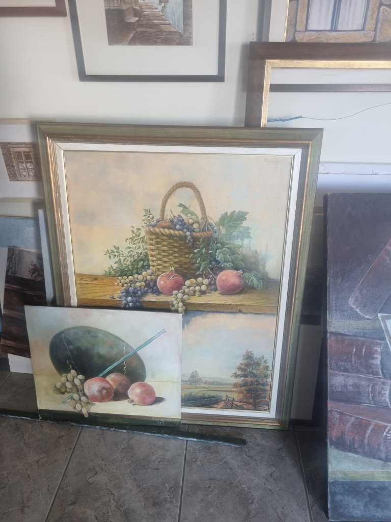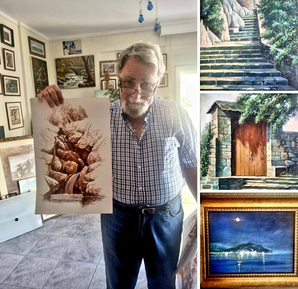 Ich besuchte gestern noch den Künstler DIMITRIS KARAGIANNOS aus Chalkidiki, der in dem Küstenort Nei Espivates in der Nähe von Thessaloniki eine kleine Galerie mit sehr vielen großen und großartigen Bildern hat. Öl, Aquarell und sehr gern mit brauner Tinte malt er v.a. Landschaften und Stillleben, letztere gerne auch als Bücherstapel – ein Sujet, das immer wiederkehrt.