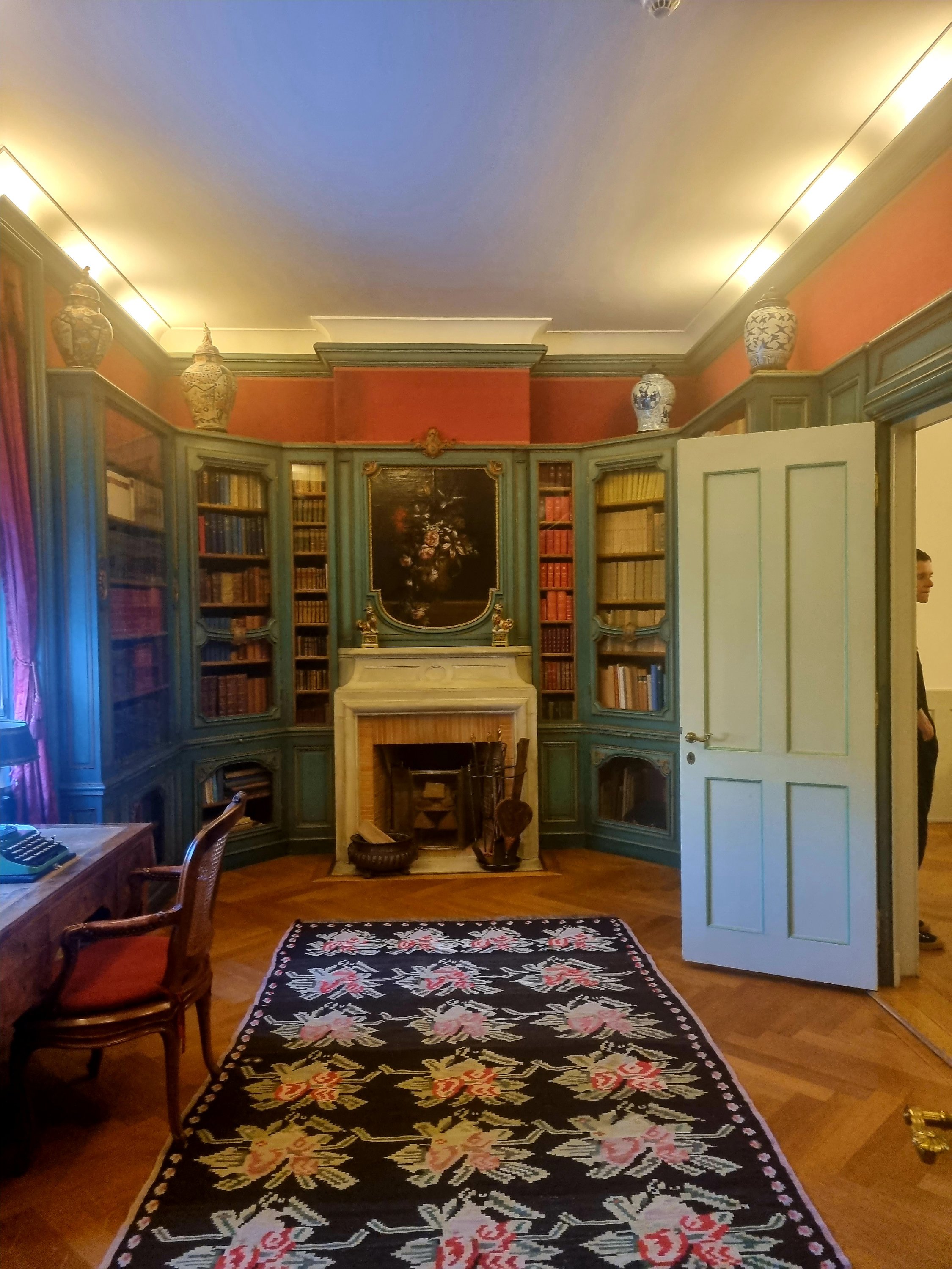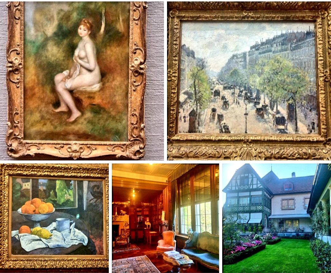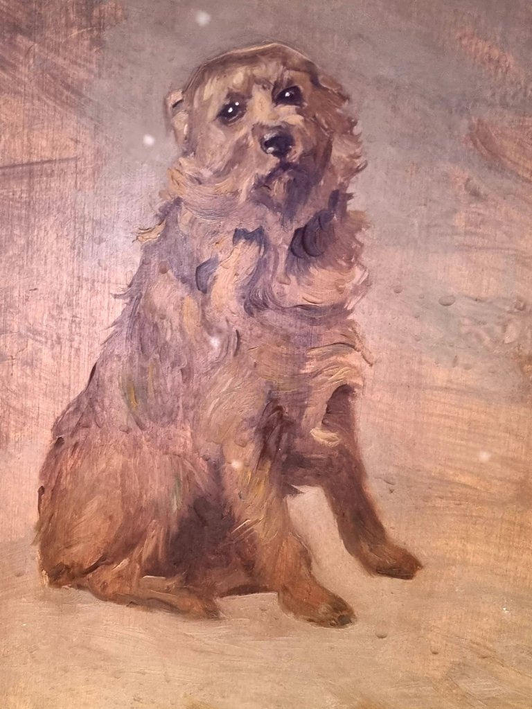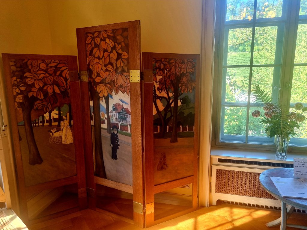 In der Villa Langmatt im Schweizer Ort Baden kann man noch bis zum 10.12. (Zweijährige Renovierung steht an – Wiedereröffnung 2026) dieses Jahres wundervolle impressionistische und vorimpressionistische Gemälde sehen, die vom Firmengründer Sidney Brown (Firma Brown und Boveri) und seiner Frau JENNY BROWN-SULZER (1871-1968) gesammelt wurden. Was mich besonders rührte, war aber auch das Atelier der selber als Malerin tätigen Jenny, das noch erhalten ist in der wunderschönen Villa mit Park. Dort findet sich auch dieser von ihr gemalte Hund auf einem Paravent.