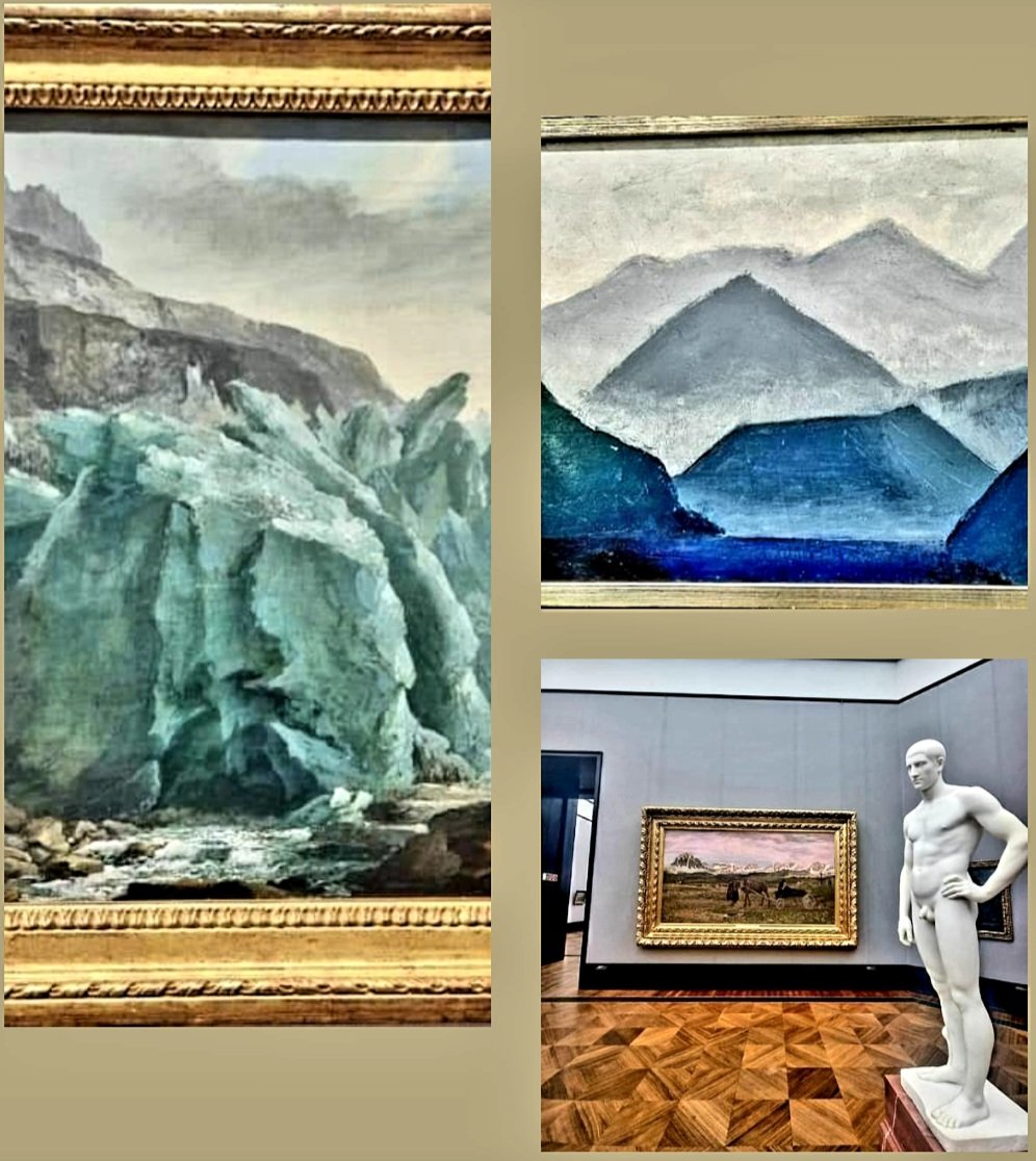 Die Welt der Berge wird hier Thema bei 3 Künstlern aus 3 Jahrhunderten, wobei der einzige, der wirklich sich den Alpenbildern verschrieben hatte, der Schweizer CASPAR WOLF (1735-1783) ist, der heute seinen 240. Todestag hat. Sein wundervoll türkisfarbenes, sehr realistisch gemaltes Gletscherbild sah ich noch vor kurzem im Kunst Museum Winterthur. Seine Schweizer Kollegin aus dem 20. Jahrhundert MERET OPPENHEIM (1913-1985) hätte heute den 110. Geburtstag. Ihr moderneres Bergbild sah ich in einer ihr gewidmeten Ausstellung 2021 im Kunstmuseum Bern . Der dritte, einziger Deutscher der Runde, der Bildhauer ADOLF VON HILDEBRAND (1847-1921), hätte ebenfalls heute Geburtstag und hatte tatsächlich auch eine enge Beziehung zur Schweiz: er wuchs in Bern auf, da sein Vater dort beruflich tätig war. Seine stehende Marmorskulptur sah ich im Frühling dieses Jahres in Berlin, in der Alten Nationalgalerie. Amüsanterweise hing an ihrer Seite das Bild eines anderen Alpenmalers: GIOVANNI SEGANTINI.