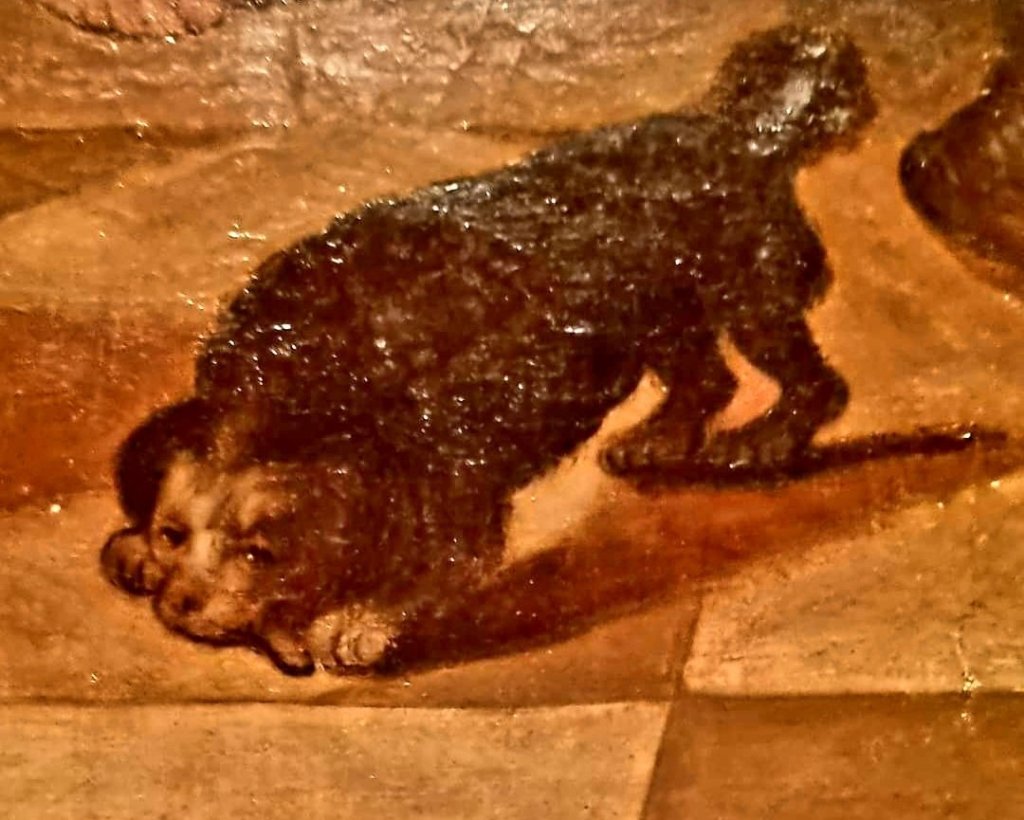 Dieses possierliche Kerlchen hat ein berühmter Maler und Mönch aus Luxembourg 1794 gemalt, der heute Geburtstag hätte: JEAN LOUIS GILSON, auch genannt FRÈRE ABRAHAM (1741-1809). Dieses Detail seines Bildes „Hochzeit zu Cana“ fiel mir im Musée d’histoire et des beaux arts in Luxembourg auf.