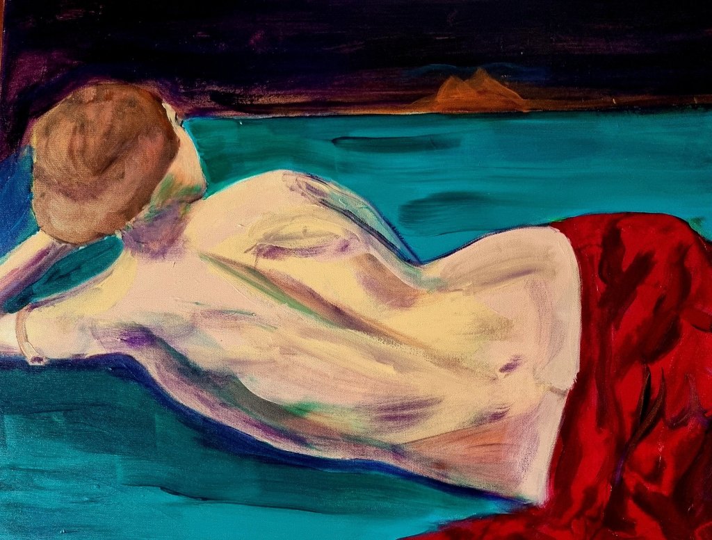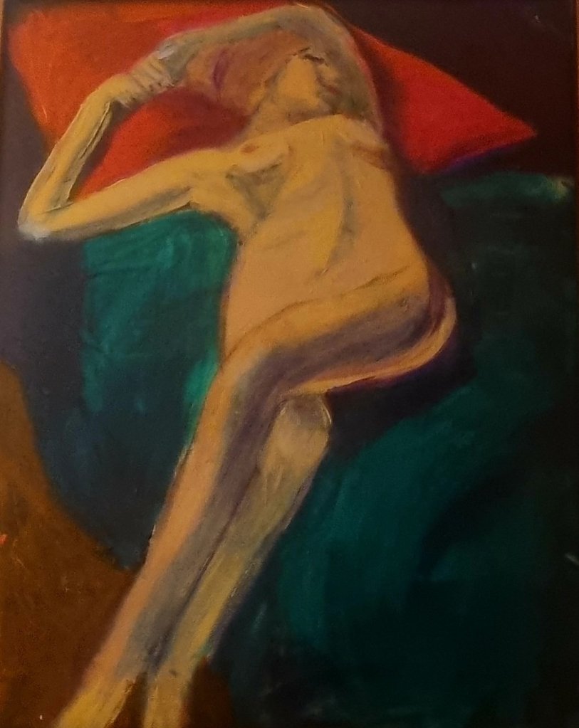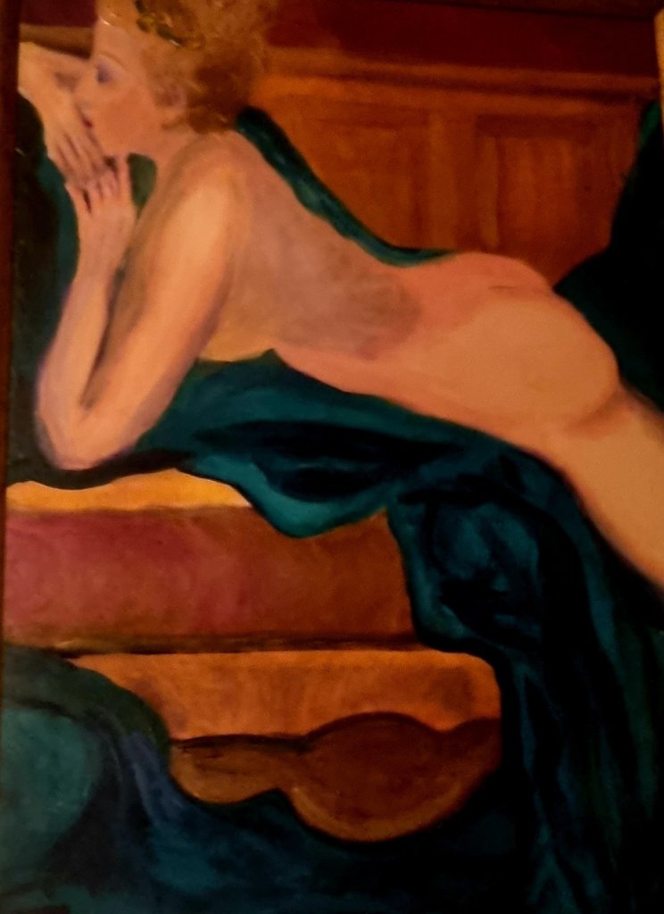 3 sind eine Serie: „Intimacy 3“ ist fertig (60×40) nach „Intimacy 2“ (30×40) und „Intimacy 1“ (auch „Louise in grün“ genannt 50×70) – alle 3 sind bewusst auf die Nähe zur Protagonistin angelegt, daher der Titel. Alle 3 sind auch Hommagen, mit deutlichen Veränderungen in Farbwahl, Pinselführung und Perspektive, an Boucher, Bondy und Feuerbach.