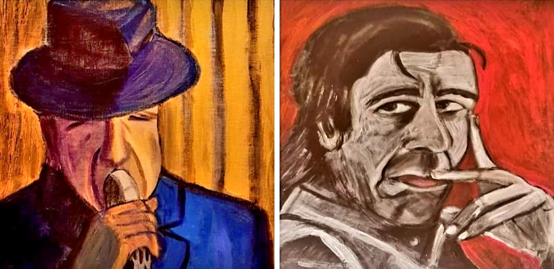 LEONARD COHEN hat heute seinen 7. Todestag- er ist einer meiner Lieblingssänger, dessen Musik ich gerne während des Malens höre. Insofern habe ich ihn schon 3mal gemalt: 2 davon verkauft so wie das gold-blaue Altersportrait links. Den jüngeren Leonard habe ich noch bei mir zu Hause hängen.