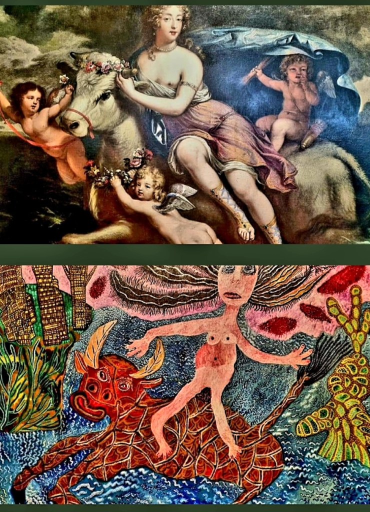 Ein Künstler kommt heute schon wieder, der gerade letzte Woche Geburtstag hätte, denn er starb 5 Tage nach seinem 77. Geburtstag. Heute ist sein 106. Todestag: der französische Bildhauer AUGUSTE RODIN (1840-1917), an dessen Geburtstag letzten Sonntag ich unerwartet meiner Lieblingsskulptur von ihm gegenüberstand, die ich schon selber mehrfach aus den verschiedensten Winkeln gemalt (und viermal verkauft) habe: der unnachahmlich zärtlich behauene Marmor „Kuss“, bei dem man die Berührung so sehr nachempfinden kann. Ursprünglich mir aus dem Rodin Museum in Paris bekannt, fand ich diese Skulptur in der derzeit laufenden Ausstellung „Nudes“ des LWL Kunstmuseum Münster . Highly recommended❣️ Zwei weitere artists of the day, die beide das gleiche Motiv – Europa auf dem Stier – gemalt haben, hätten heute Geburtstag: der Franzose PIERRE MIGNARD (1612-1695), gesehen im Kurpfälzischen Museum Heidelberg. Seine „Entführung der Europa“ von 1675 ist mit einem Portrait – vermutlich ein Auftragsportrait – einer Mutter mit ihren Kindern verbunden. Die Kölner Künstlerin URSULA SCHULTZE-BLUHM (1921-1999) dagegen malte das Motiv in ihrer farbenfrohen, sehr individuell-wilden Weise im Jahr 1989. Es hing im Sommer dieses Jahres in der großen Retrospektive im Museum Ludwig Köln