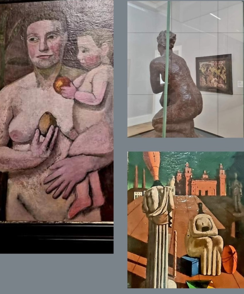 3 Künstler bringen mit ihren Werken Beunruhigendes bzw. trauriges Braun: es handelt sich auch um ihre Todestage: PAULA MODERSOHN-BECKER (1876-1907): ihre „Mutter und Kind“ sind in fahlen Farben gemalt (vor kurzem im Museum Ostwall im Dortmunder U gesehen) – tatsächlich kreisten ihre Gedanken sehr stark um den Wunsch, ein Kind zu bekommen, und als sie am Ziel ihrer Wünsche war, starb sie tragischerweise kurz nach der Geburt. Ein ähnliches Braun hat die „kleine Kauernde“ vom Bildhauer GEORG KOLBE (1877-1947), die ich in einem Museum in Gießen im Jahr 2021 sah. Und bei dem Begründer der pittura metafisica, GIORGIO DE CHIRICO (1888-1978), liegt das Beunruhigende schon im Titel: „die beunruhigenden Musen“, die ich im Mai im Kunsthaus Zürich fotografierte.