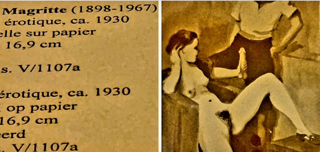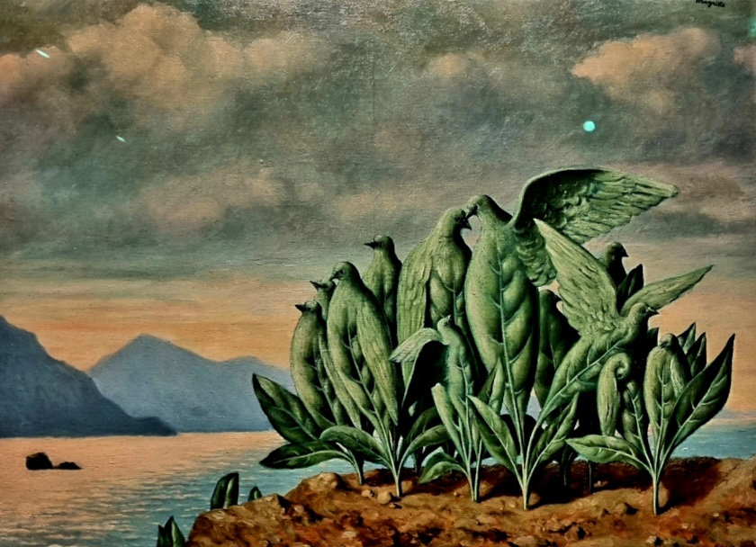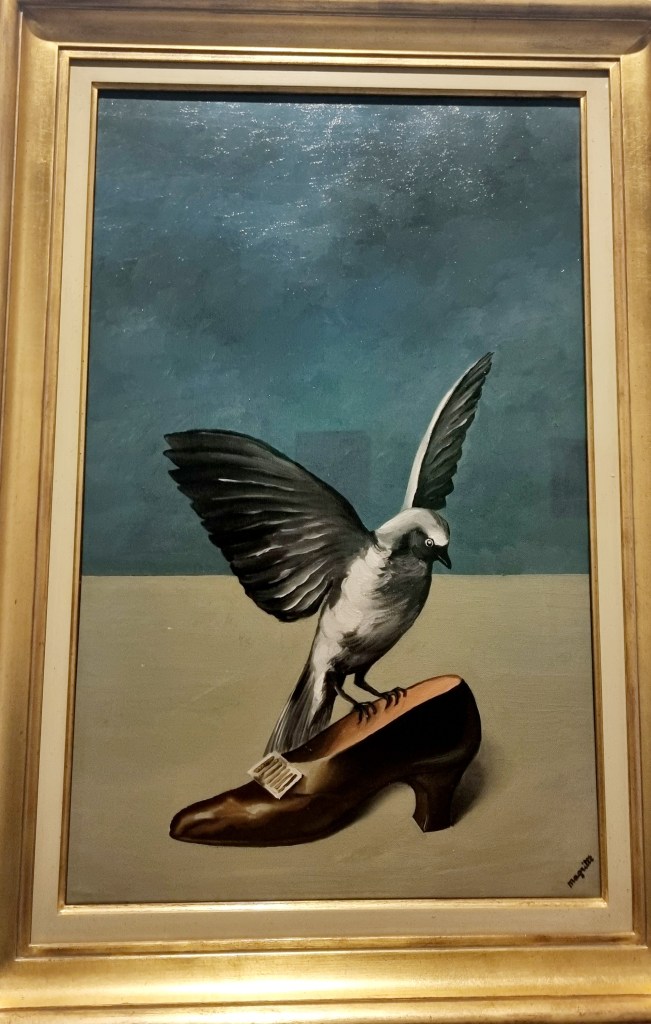 RENÉ MAGRITTE (1898-1967), der heute seinen 125. Geburtstag feiern würde, malte Vögel auf Damenschuhe („Dieu n’est pas un Saint“), Pflanzen („L’Ile au Trésor“) und neben anderen erstaunlichen Objekten um das Portrait seiner Frau herum („Georgette“). Diese Bilder sah ich im September im Musée Magritte in Brüssel, das in der Nähe vom Mont des Arts liegt.Warum heißt dieses Gemälde „Gott ist kein Heiliger“? Das wusste wohl nur Magritte selbst – wobei in dem 2. Magritte Museum in einem Brüsseler Vorort, das seine Originalwohnung mit Originalmöbeln beherbergt, man nicht nur einen ausgestopften Hund, der Magrittes weißem Zwergspitz gleicht, sieht, sondern auch eine Reihe von hocherotischen Gemälden und Zeichnungen