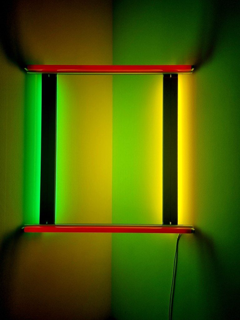 Da haben wir eine typische Lichtinstallation von DAN FLAVIN (1933-1996), amerikanischer Minimalismus- und Lichtkünstler, der heute den 27. Todestag hat. Seine unbetitelte, einem befreundeten Paar gewidmete Installation sah ich im letzten Februar in München, Neue Pinakothek .