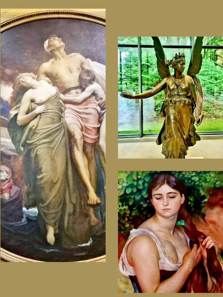 der erste links hätte Geburtstag, die beiden anderen haben ihren Todestag: ein Bild des britischen Künstlers aus dem Viktorianischen Neoklassizismus, den ich nur als Bildhauer i. Victoria and Albert Museum kannte, „begegnete“ mir vor kurzem im LWL Kunstmuseum Münster : SIR FREDERIC LEIGHTON (1830-1896). Daneben die „Siegesgöttin“ von CHRISTIAN DANIEL RAUCH (1777-1857), gesehen in diesem Sommer im wunderschönen Skulpturenpark Waldfrieden in Wuppertal. Und darunter ein Bild, genannt „der Zopf“, vom berühmtesten dieser 3, die hier so gut zusammenpassen: AUGUSTE RENOIR (1841-1919), fotografiert im September in der bezaubernden Impressionisten- Ausstellung der Villa Langmatt in der Schweiz.