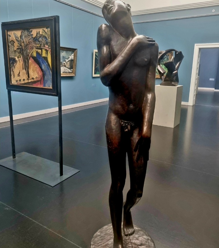 2 Geburtstagskinder bei diesem schönen Schnapszahlendatum werden in einem Fall bestimmt mit Ausstellungen gefeiert: es handelt sich um den 160. Geburtstag des berühmten Norwegers EDVARD MUNCH (1863-1944). Seine Umarmungsszene gehört zum sogenannten Lebensfries, den ich 2021 in Berlin, Neue Nationalgalerie, sah. Sein Zeitgenosse, der österreichisch-italienische Bildhauer ERNESTO DE FIORI (1884-1945) hat verschiedene „Jünglinge“ geschaffen. Den „Leidenden“ sah ich in diesem Sommer in der Kunsthalle Mannheim, sehr schön aufgestellt vor einem Kirchnerbild.