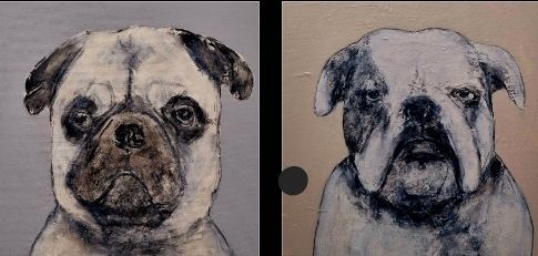 Diese beiden ernstschauenden – Mops und englische Bulldogge – wurden von der zeitgenössischen Malerin Geli von der Schulenburg gemalt. Ich sah sie Ende Februar in der art KARLSRUHE . Merkwürdig war allerdings die Anordnung im Bild: die Künstlerin (ich habe die Fotos etwas beschnitten) platzierte sie am unteren Bildrand und ließ die beige-graue Fläche darüber frei. Was sie wohl damit ausdrücken wollte? Ebenso merkwürdig war auch die Anordnung ihres Namens: GELIVON DER SCHULENBURG.