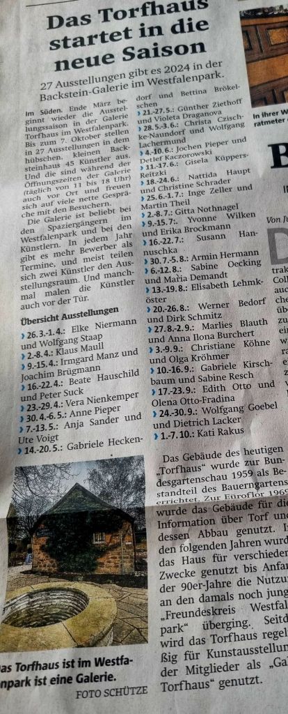 Am letzten Wochenende konnte ich einen letzten Blick auf die Torfhaus-Wintergalerie im Westfalenpark erhaschen – die Ausstellung von Wolfgang Goebel und Dietrich Lacker – und einen Anfangsblick auf 2 noch anhaltende Ausstellungen, deren Vernissagen gefeiert wurden: Einzelausstellung von Matthias Max Klemann im Schloss Rodenberg und Gemeinschaftsausstellung von Marc Bühren u.a. im „Friedrich“ genannten Ausstellungsraum des Hörder Kulturladens.