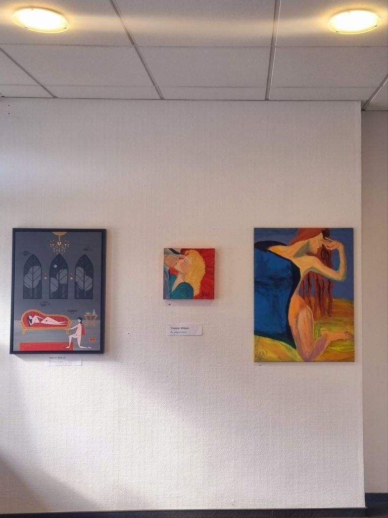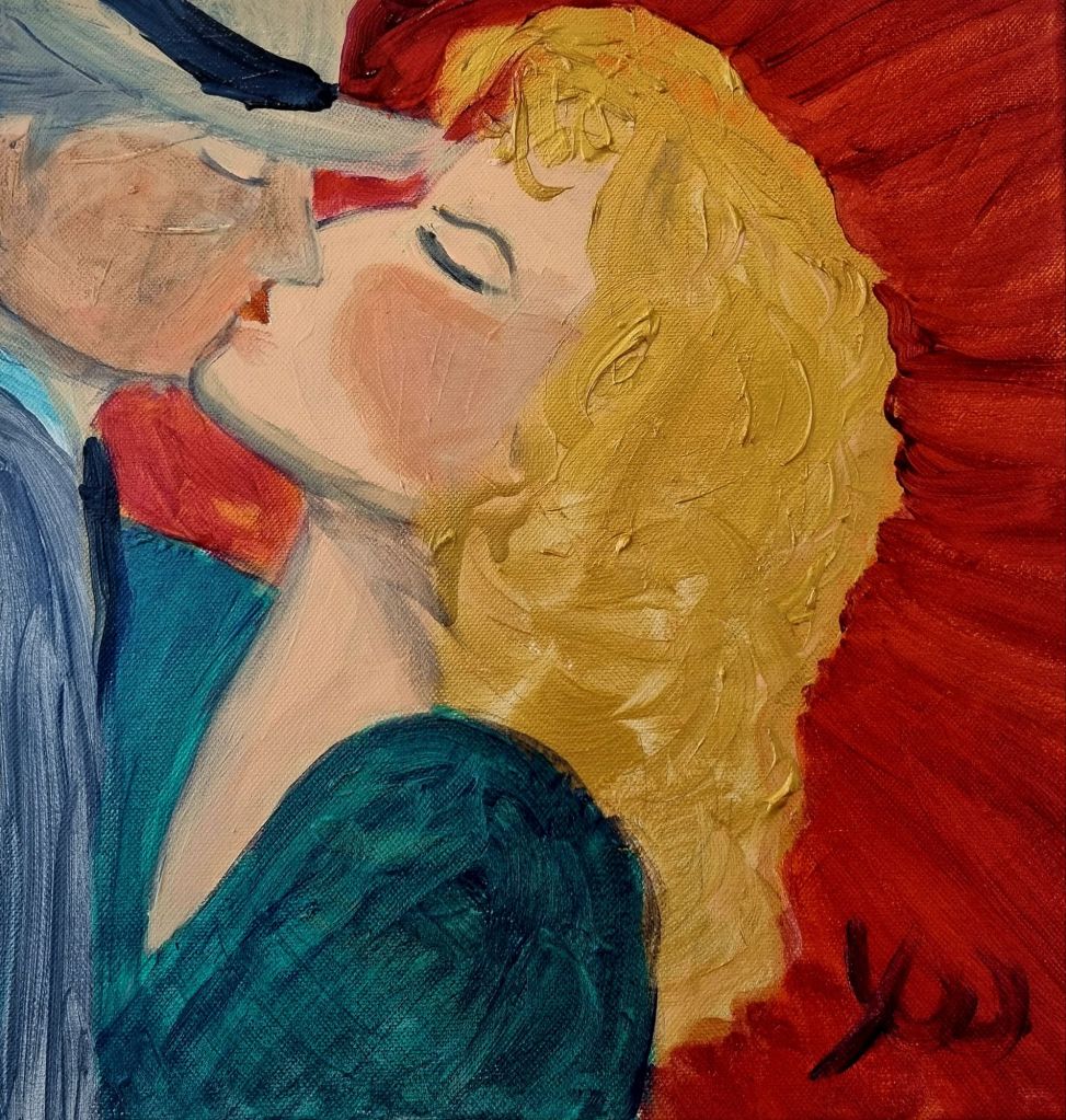 in Aplerbeck im Raum für Kunst auf Zeit hängt jetzt mein neues Bild „Kuss und Umarmung in der Pop Art, inspiriert von Roy Lichtenstein“, aber gemalt auf meine Weise und in meinen Farben, ohne den Lichtensteinschen „Pointillismus“ zu berücksichtigen. Das Bild (Acryl auf 3D-Leinwand 30×30) hängt jetzt zwischen dem großen von Katrin Rakus und meiner „Ukrainia“ im Vorraum der Galerie. Bilderwechsel 2 war heute auch im Salon Rani in Herdecke nötig, weil ich ja am Donnerstag „mein Herz gehört Paris“ verkauft hatte und nun ein leerer Platz an der Wand entstanden war. Mein kleines „Frühling“sbild (mit Bierbaum-Gedicht auf der Rückseite) schien mir für die Jahreszeit passend.