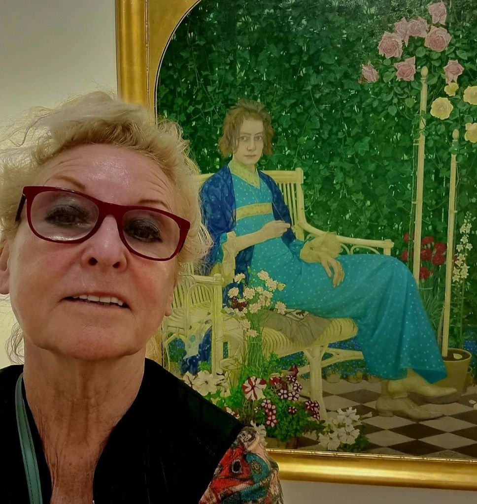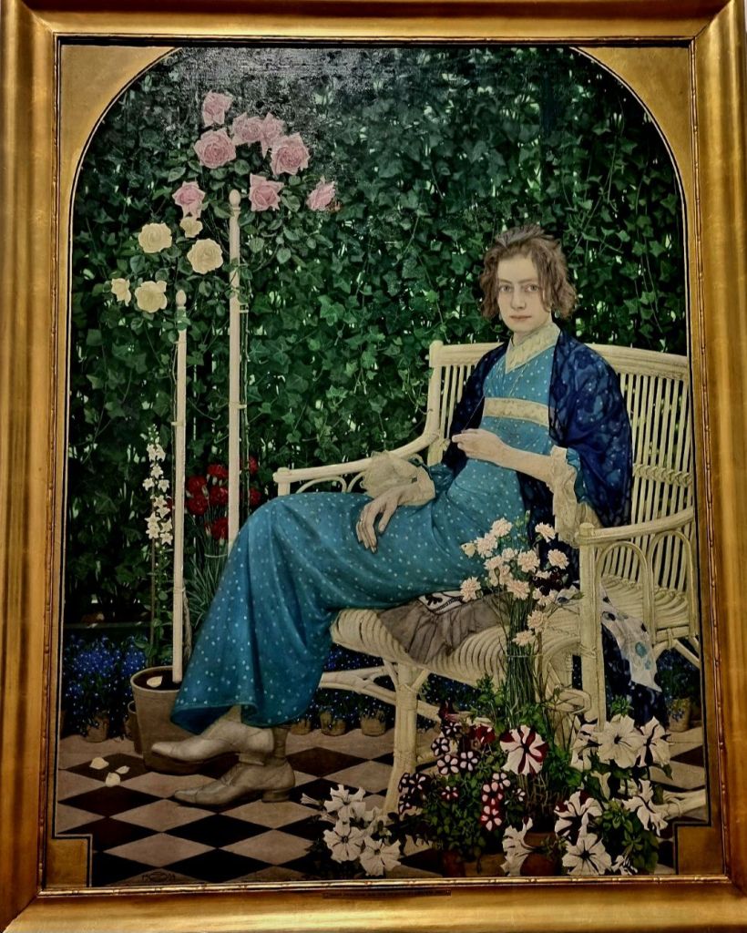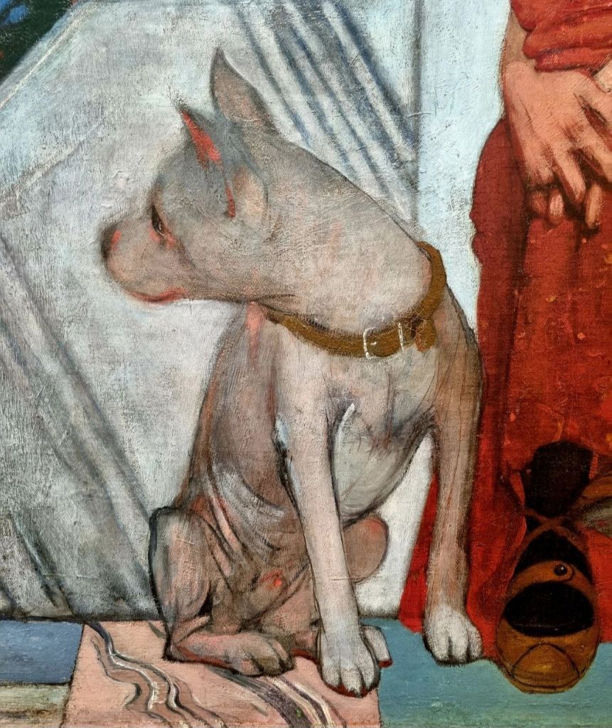 Von OSKAR ZWINTSCHER (1870-1916), dem Leipziger Maler, der heute Geburtstag hätte, gibt es diesen weißen Boxer- oder Doggenmischling im 1895 gemalten Bild „Sehnsucht“. 1904 malte er das „Bildnis mit Blumen“, vor dem ich im April 2023 im Hessischen Landesmuseum für Kunst in Wiesbaden staunend stand.