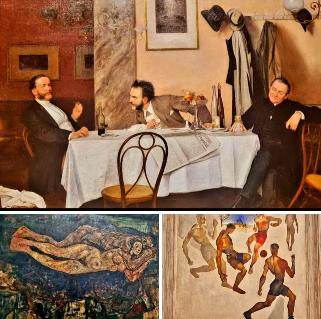 Die übrigen gehören 3 weiteren Nationen an und haben doch eine Gemeinsamkeit außer der, im 19. Jahrhundert geboren und im 20. gestorben zu sein – alle 3 haben versucht, die sozialen Lebensbedingungen ihrer Zeit darzustellen. Geburtstagskinder heute sind der deutsche Maler der Düsseldorfer Schule CARL EMIL SCHWABE (1856-1924) mit seinem schon 1887 entstandenen sehr realistisch gemalten Bild „Ungelöste Fragen“ (im Kunstpalast, Düsseldorf im letzten Dezember gesehen) und der österreichische, früh an Spanischer Grippe verstorbene Maler EGON SCHIELE (1890-1918) mit seinem unvollendeten „Liebespaar“ von 1918, das mich im Leopold Museum in Wien vor kurzem berührte. Der Russe ALEXANDER DEINEKA (1899-1969), dessen Todestag heute ist, malte „Fußball“ im Jahr 1924, es passt natürlich zum Sportinteresse in diesen Tagen. Ich entdeckte es vor kurzem im Museum Albertina in Wien.