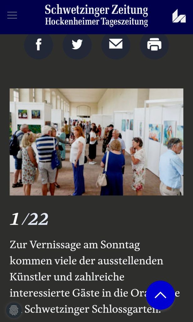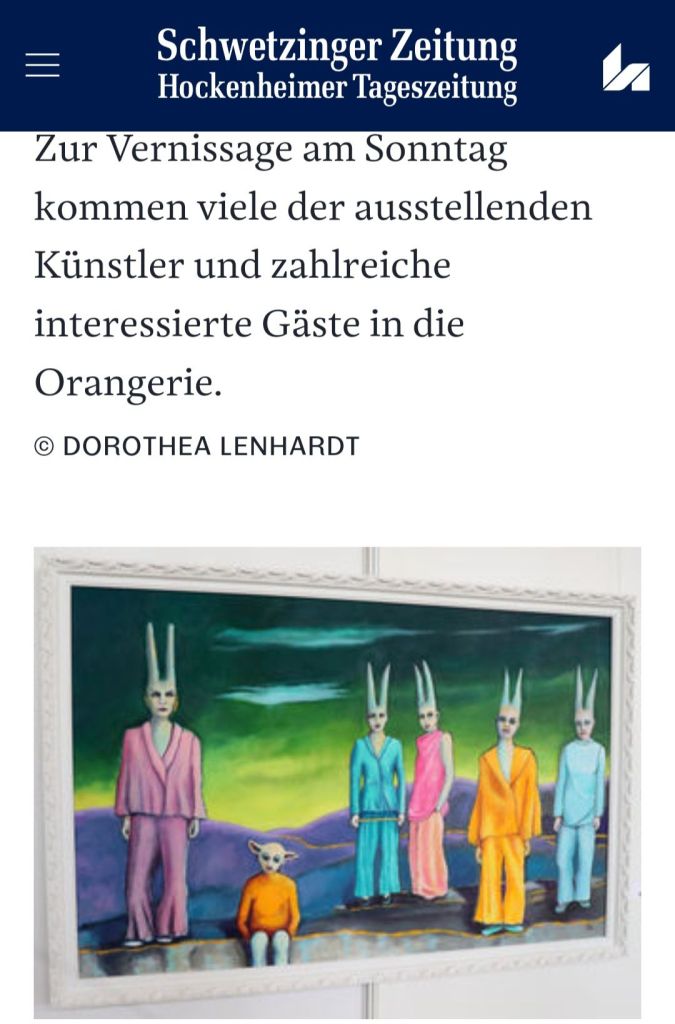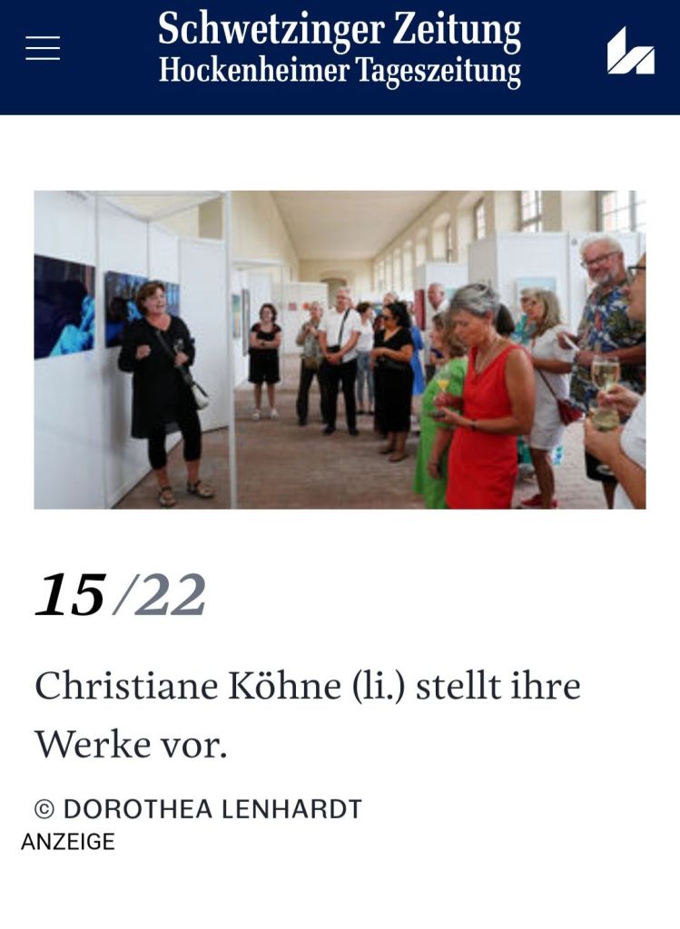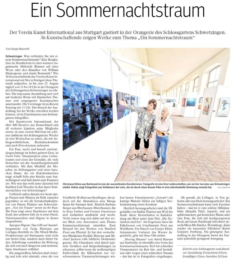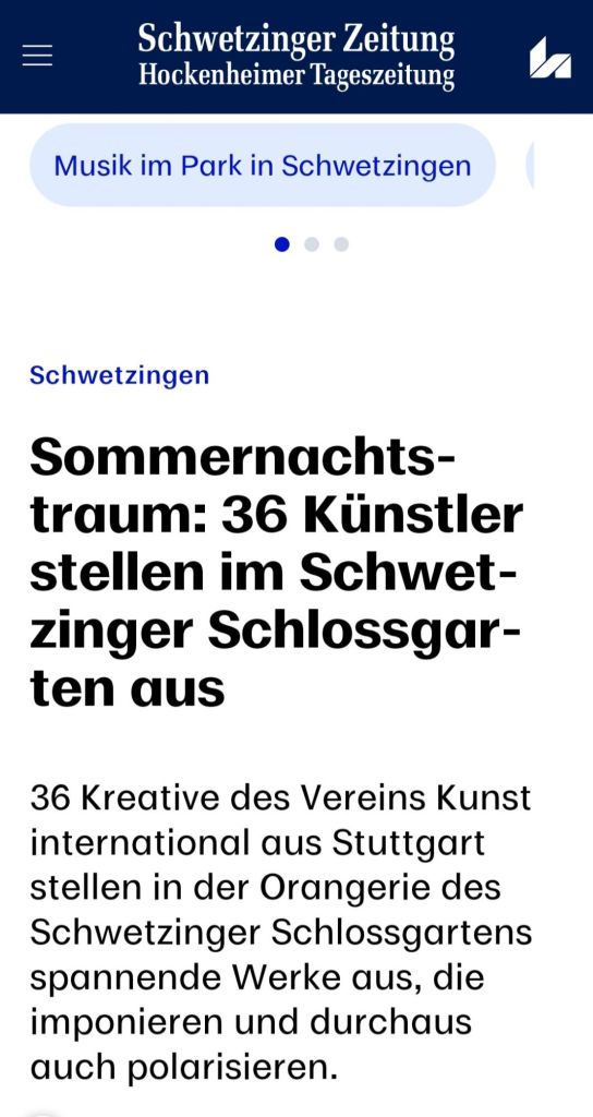 Drei Zeitungsberichte (teils online) liegen schon vor zu unserer Ausstellung und Vernissage in der #orangerieschlossschwetzingen „Ein Sommernachtstraum“, organisiert vom Stuttgarter Verein KUN:ST International mit Bildern von 36 seiner Mitglieder (darunter auch 4 meiner Bilder – ich hüpfe übrigens im langen Türkisen durchs Foto der Schwetzinger Zeitung)… die sympathische Journalistin Katja Bauroth hatte ich letztes Jahr kennengelernt, dieses Jahr hat sie ein interessantes Interview mit der Dortmunder Künstlerin Christiane Köhne gemacht. Alles in allem – auch in der Kunstzeitung Metropol – eine tolle engagierte Berichterstattung❣️