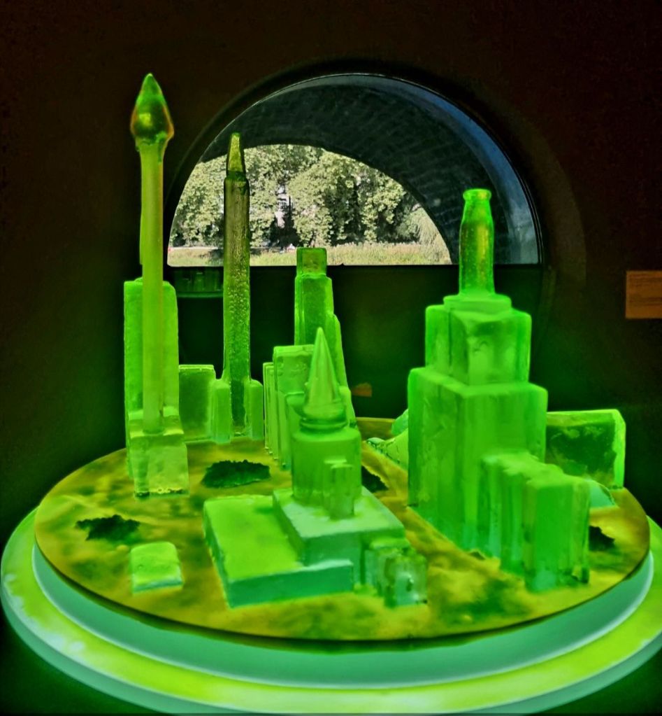 die Soloausstellung des amerikanischen Performancekünstler MIKE KELLEY (1954-2012) in der schönen historischen Atmosphäre des Ständehauses (ein Beispiel der Architektur ist hinter der „green city“ aus Harz zu sehen – das Fenster an der Wasseroberfläche)