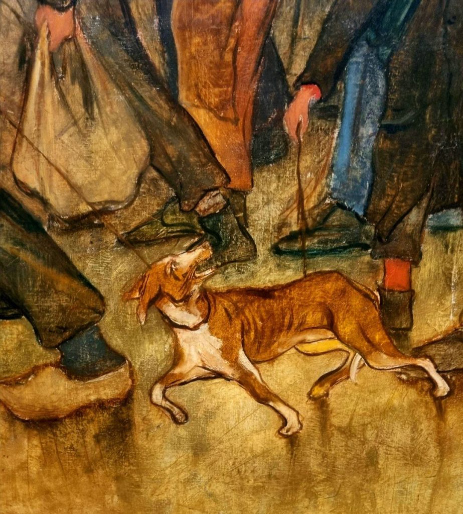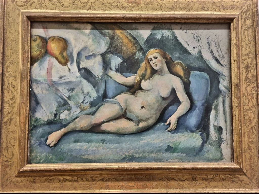 EUGÈNE LAERMANS (Baron Laermans) (1864-1940), vor genau 160 Jahren in Belgien geboren, malte in seinem Bild „les Emigrants“ mitten unter der Gruppe von Auswanderern diesen kleinen Hund, aus dessen Miene man nicht genau lesen kann, ob er fröhlich mit seinen Menschen mitläuft oder verzweifelt ist, weil er spürt, dass er in ein ungewisses Schicksal läuft. Laermans Leben selber verlief trotz großer Erfolge (er bekam wegen seiner Verdienste in der Kunst 1927 den Adelstitel Baron verliehen) tragisch: isoliert durch Taubheit schon seit Kindertagen und unfähig zur Kommunikation, bedeutete ihm Malen alles, doch er verlor mit 45 Jahren bereits sein Augenlicht und konnte die letzten 30 Jahre seines Lebens nicht mehr malen. Ich sah sein Bild (Detail) im September 23 in der „Fin de Siècle“-Ausstellung in den Musées royaux des beaux-arts de Belgique in Brüssel. PAUL CÉZANNE (1839-1906), französischer Postimpressionist, hat heute seinen 118. Todestag. Seinen liegenden Akt sah ich im März im Von Der Heydt-Museum Wuppertal. Das Bild gehört zur Sammlung. Erstaunlich finde ich die Birnen vorne links in Größe und Ausrichtung. Wirft die Liegende mit ihnen und dem Bettlaken nach dem Maler/Betrachter?