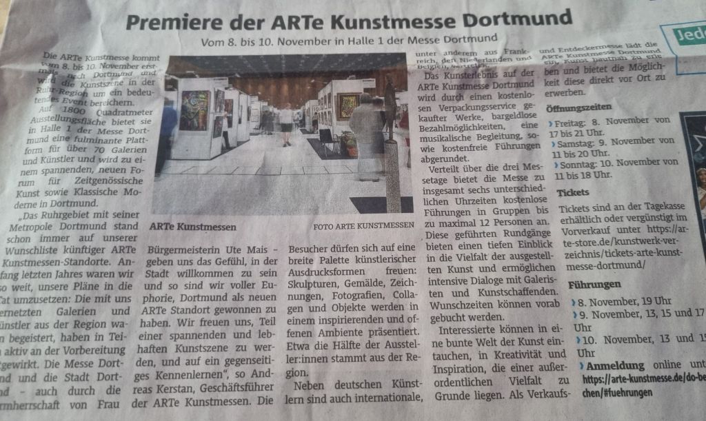 ARTe Kunstmesse Dortmund im Messecenter Halle 1 neben der Westfalenhalle. Ich werde jeden Tag anwesend sein (Fr17-21/Sa11-20/So11-18) bei den Ständen des KUN:ST International Vereins D4/1. Voilà ein schöner Artikel in den Ruhr Nachrichten Dortmund heute mit Zitaten von Andreas Kerstan, dem Vorsitzenden des Vereins.Ich freue mich darauf