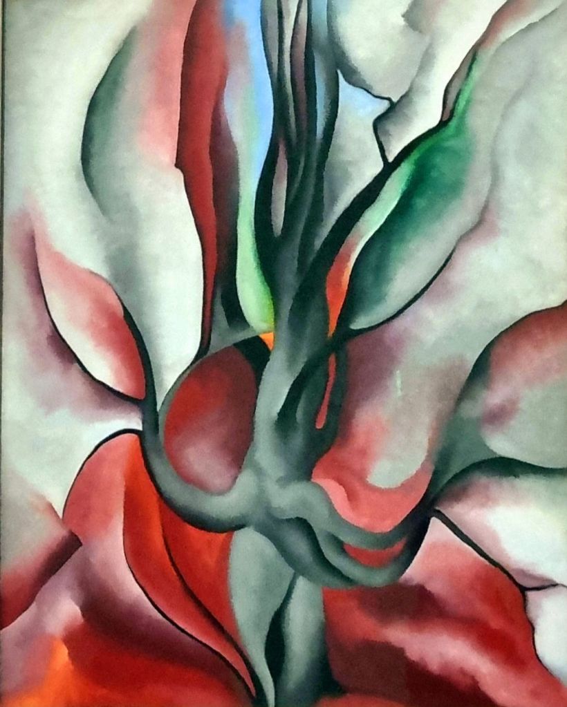 Heute hätte eine meiner Lieblingsmalerinnen den 134. Geburtstag: GEORGIA O’KEEFFE (1887-1986). Ich habe hier schon fast alle ihrer 2022 in der Fondation Beyeler in Riehen bei Basel gezeigten Bilder aufgeführt – außer diesem, einem ihrer Herbstbaumbilder. Rot und grün zählen zu meinen eigenen Lieblingsfarben beim Malen, und Georgias geschmeidige Formen, die manchmal Akten ähneln und doch zumeist Pflanzen und Landschaften zeigen, werden auch in diesem Bild deutlich sichtbar.