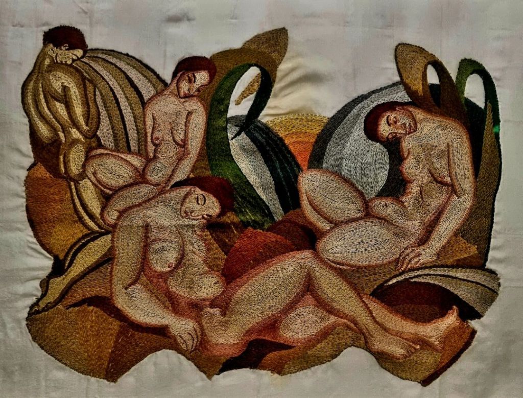 Klassischerweise zeige ich ja am 11. jedes Monats einen schönen männlichen Akt: dieses Mal fiel er mir – in Seide gestickt und mit 3 weiblichen Akten verziert – im Museum Ostwall im Dortmunder U auf: in der noch laufenden Ausstellung expressionistischer und Fluxuskünstlerinnen mit dem schönen selbstbewussten Titel „Tell these people who I am“: die Textilkünstlerin MARTA WORRINGER (1881-1965) hat den männlichen Rückenakt geschaffen.