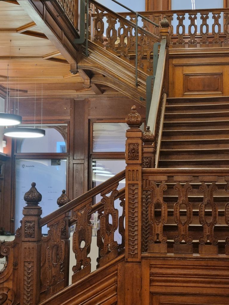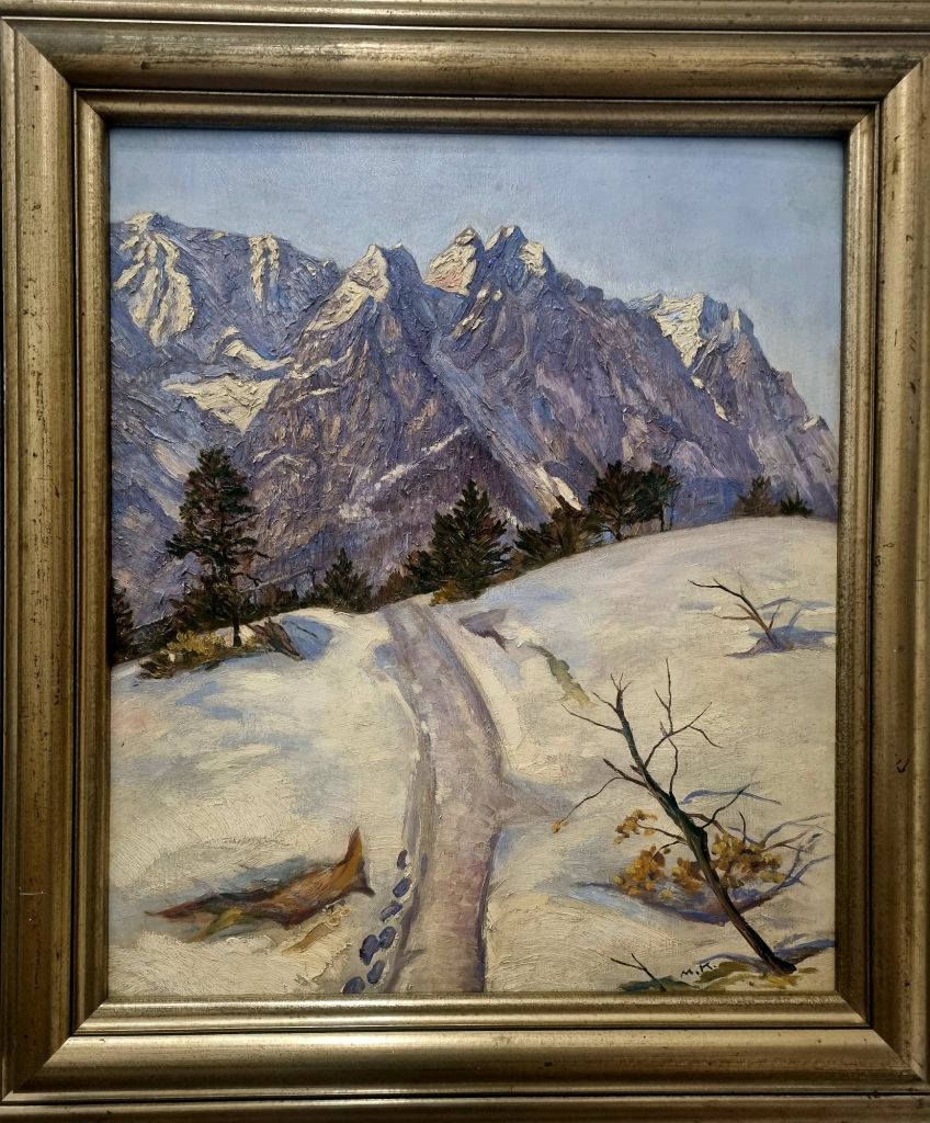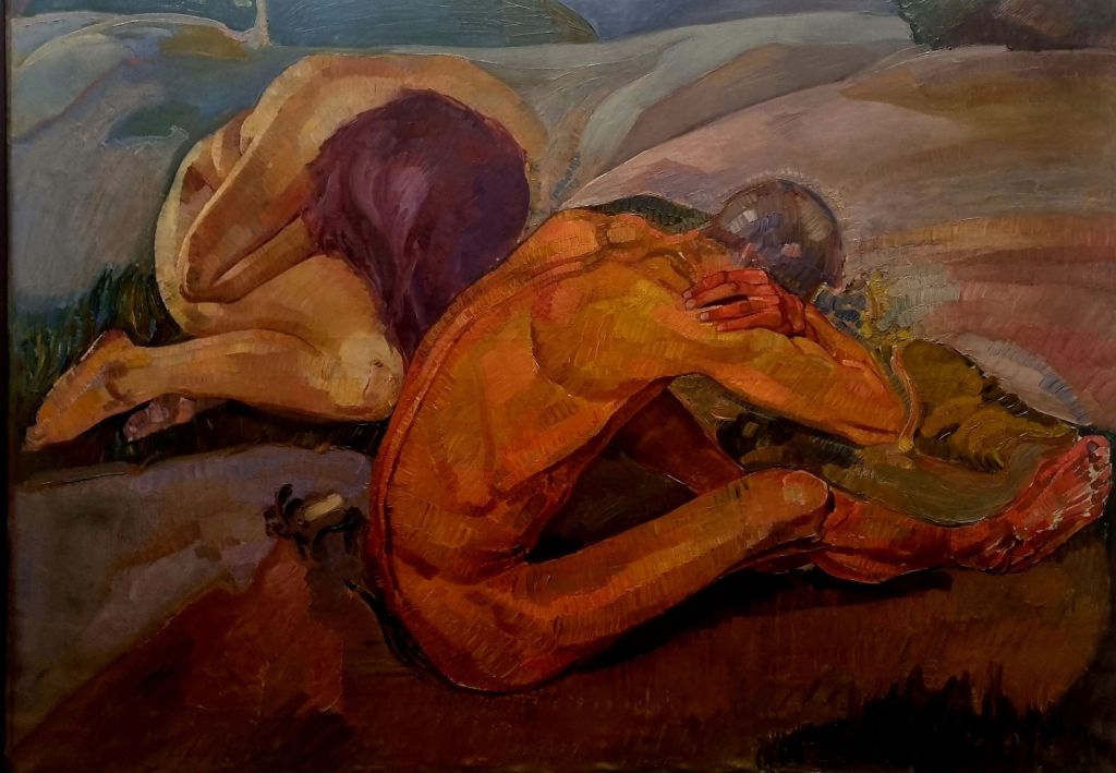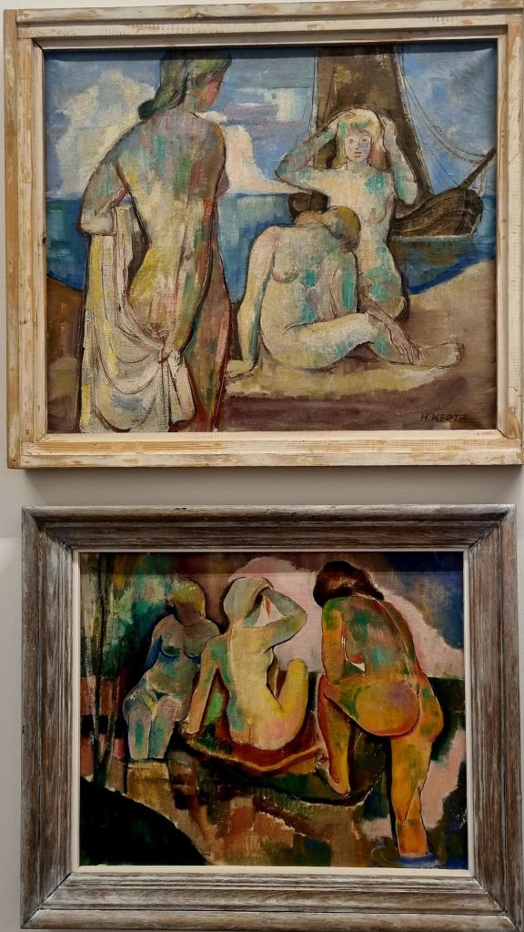 KUNSTVILLA – hier mit den Bildern der Nürnberger Malerfamilie KERTZ – den Brüdern ADOLF KERTZ (1880-1918), dem das Figurenpaar und eindrucksvolle andere Bilder zuzuordnen sind in einer kurzen Lebensspanne (gefallen im 1. Weltkrieg), und MAX KERTZ (1882-1949), vornehmlich Landschaftsmaler, und dessen Sohn HEINRICH KERTZ (1904-1950), der die 2 Akte malte. Dessen Sohn, dem 2021 verstorbenen Opernregisseur PETER KERTZ, ist es zu verdanken, dass die Bilder der Familie im schönen Neobarockbau der Kunstvilla zu sehen sind – neben einer großen Anzahl von anderen einheimischen Malern ihrer Zeit.