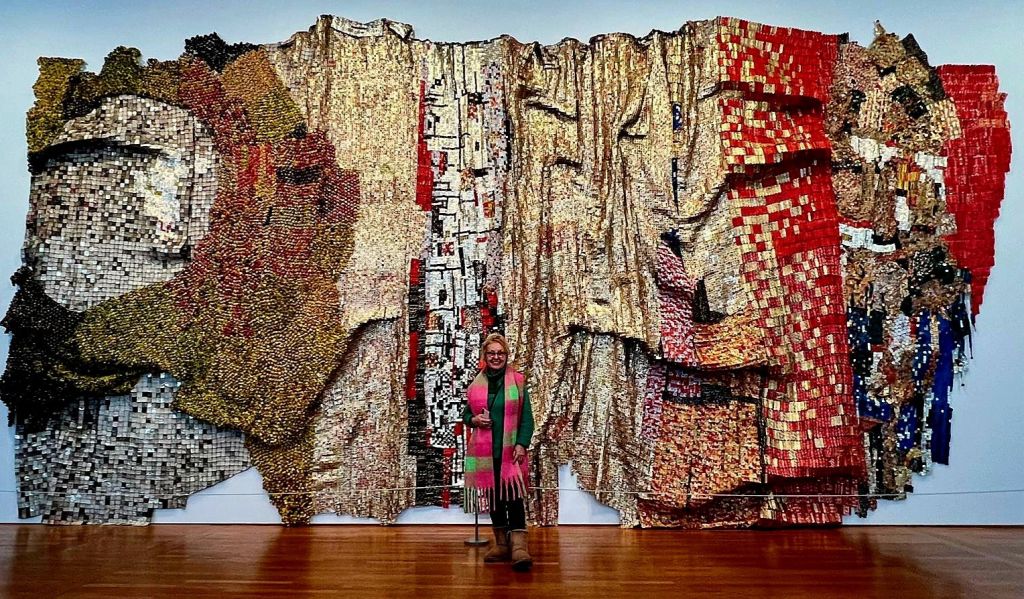 Ich bin ja immer sehr zufrieden mit meinem Sternzeichen, dem Wassermann, und freue mich, was für tolle, eigenwillige Künstler sich rund um meinen Geburtstag tummeln – zum Beispiel heute feiert EL ANATSUI seinen 81. Geburtstag. Der ghanaische Bildhauer erschafft riesige Skulpturen – oft aus Alltagsmaterialien. Eine besonders schöne mit verarbeiteten Flaschenschließungen u.a. sah ich vor ein paar Tagen im Kunstmuseum Bern und wurde davor fotografiert, was die Größe des Formats zeigt.