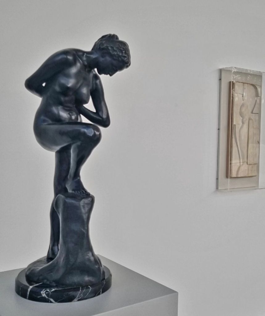 2 malende Künstler aus dem (vor)letzten Jahrhundert , die heute Geburtstag hätten, muss man nennen: der Schwede ANDERS ZORN (1860-1920) und der Schweizer ALBERT WELTI (1862-1912). Die hübsche, glückselig lächelnde Raucherin malte „le maître de la peinture suédoise“ (so der Titel des Katalogs, den ich nach der faszinierenden Ausstellung im Petit Palais, musée des Beaux-arts de la Ville de Paris erwarb und aus dem ich das Foto nahm) im Jahr 1892, 4 Jahre später fertigte Welti die „Mondnacht“ an, eine der Radierungen, die im Januar vom Kunsthaus Zürich gezeigt wurden.Außerdem drängen sich drei Bildhauer mit einer Dame darum, noch unter dem Sternzeichen des Wassermanns geboren zu sein. Die 3 hätten heute Geburtstag, die Dame hat: YOKO ONO kann man heute zum 92. Geburtstag gratulieren. Das Foto machte Beate Marschke von mir vor dem Ausstellungsplakat in der K20 K21 Kunstsammlung Nordrhein-Westfalen. Die Ausstellung läuft noch. Die Herren sind in chronologischer Geburtsjahr-Reihenfolge MAX KLINGER (1857-1920) mit der Bronze des „badenden Mädchens“ ( 2023 im Skulpturenpark Waldfrieden in Wuppertal gesehen), der Franzose HENRI LAURENS (1885-1954) mit der „Femme aux Boucles d’Oreille“, gesehen im letzten Monat im Kunstmuseum Bern, und GERHARD MARCKS (1889-1981) mit seiner Bronze „Junitau“, die ich im letzten Jahr wohl im LWL-Museum für Kunst und Kultur in Münster fotografierte.