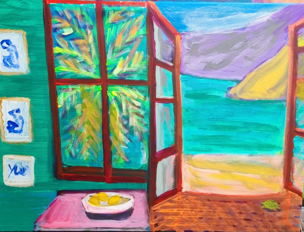 Vielleicht passt es in seiner Buntheit ja auch zu Karneval: ein neues Bild, von mir gemalt: eine Hommage an Matisse.“Eine andere Geschichte“ – zusammengesetzt aus Motiven aus 6 Matisse-Bildern, Ergebnis meiner Eindrücke der großartigen Matisse-Ausstellung, die ich Ende Januar in Basel-Riehen in der Fondation Beyeler sah. Auch die kleine Schildkröte, die im Begriff ist auf den Strand hinauszukrabbeln, ist ursprünglich ein Matisse-Motiv, wenn auch in einer anderen Farbe. Acryl auf Leinwand, 60(b) x 47(h)