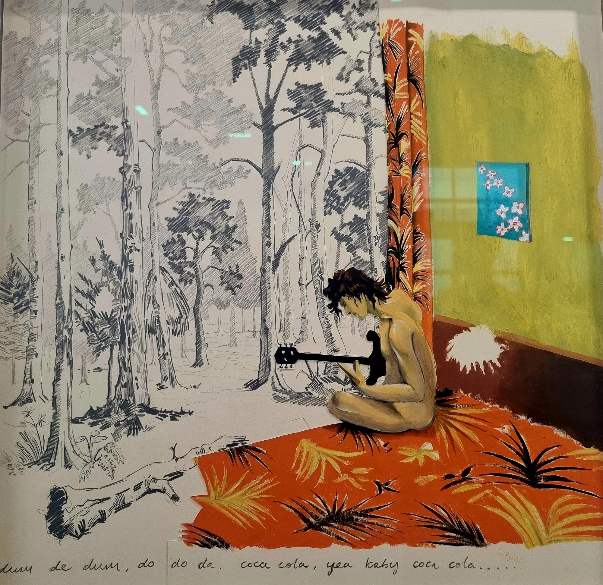 Der 11. jeden Monats ist ja immer (oder meistens) der Tag der schönen männlichen Akte. Eine Gitarren spielende Variante fiel mir neulich (Ende Februar) bei der art karlsruhe auf: „Room Service“ von 2023 (oil and pencil on paper – da hinter Glas mit geringfügigen Spiegelungen) vom jungen irischen Künstler DAVID EAGER MAHER.