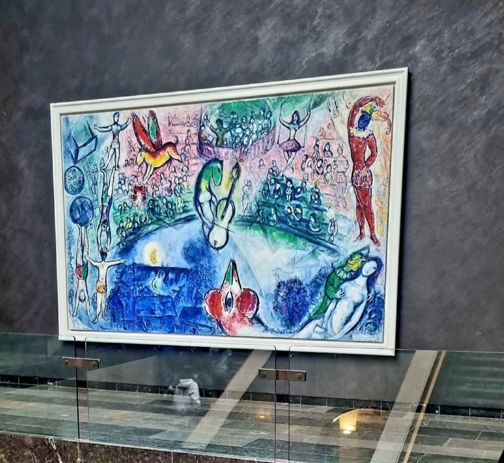 Ich hatte gehofft, vor MARC CHAGALLS heutigem 40. Todestag vorher noch die laufenden Ausstellungen in Düsseldorf und Münster zu sehen, aber das klappte leider nicht. Umso mehr erfreute es mich, schon beim Hereinkommen ins Städel Museum in Frankfurt letzte Woche mit einem Blick ein besonders schönes und großformatiges Bild von Chagall an auffälliger Stelle wahrzunehmen: „Commedia dell’Arte“ von 1958/59.