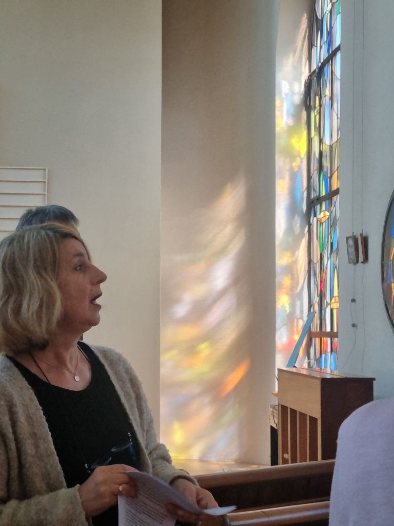 Heute geht es um Ikonen von bulgarischen Künstlern, die von Maria Rouev in dem sehr schönen lichtdurchfluteten Raum der evangelischen Kirche am Markt in Dortmund-Hombruch vorgestellt und erklärt wurden. Mir gefielen dieses Mal ganz besonders die fein gezeichneten Ikonen von ALBENA DIMITROVA , leuchtend in rosé und gold (und auch in anderen Farben, gearbeitet nach griechischen und russischen Vorbildern, obwohl ich eine Ikone von PLAMEN KAPITANSKI selbst besitze und er auch mit einigen wunderschönen Exemplaren vertreten ist, die in der noch bis zum 4. Mai gehenden Ausstellung gezeigt werden.