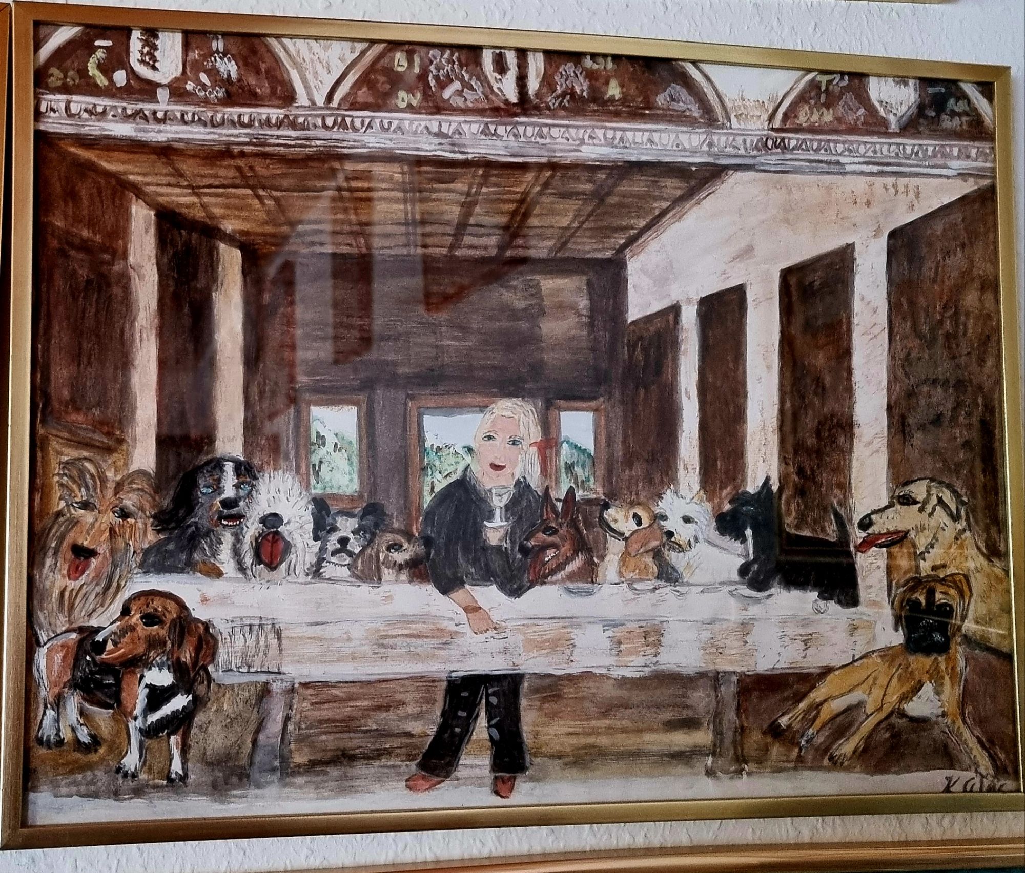Heute am Gründonnerstag gedenkt man ja des letzten Abendmahls Jesu und seiner Jünger. Meine Mutter KAROLA WILKEN (1929-2014) liebte es wie ich, Hommagen an die großen Meister zu malen, in diesem Fall DA VINCI, und frönte ebenfalls mit ihrer Aquarellversion vom Abendmahl ihrer großen Hundeliebe. An Stelle des Jesus sieht man eine Blondine, für die ich Modell saß. Man kann davon ausgehen, dass sie mit dem Bild auch ein bisschen mit ihrer erzkatholischen Kindheit in Fulda abrechnen wollte.