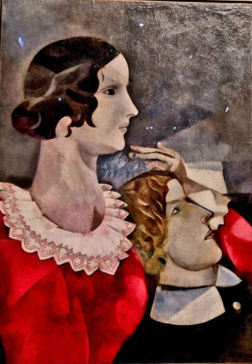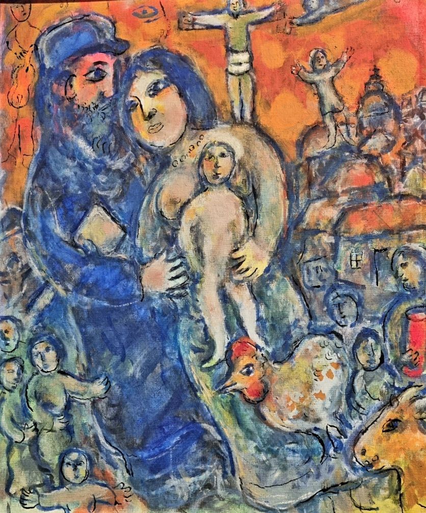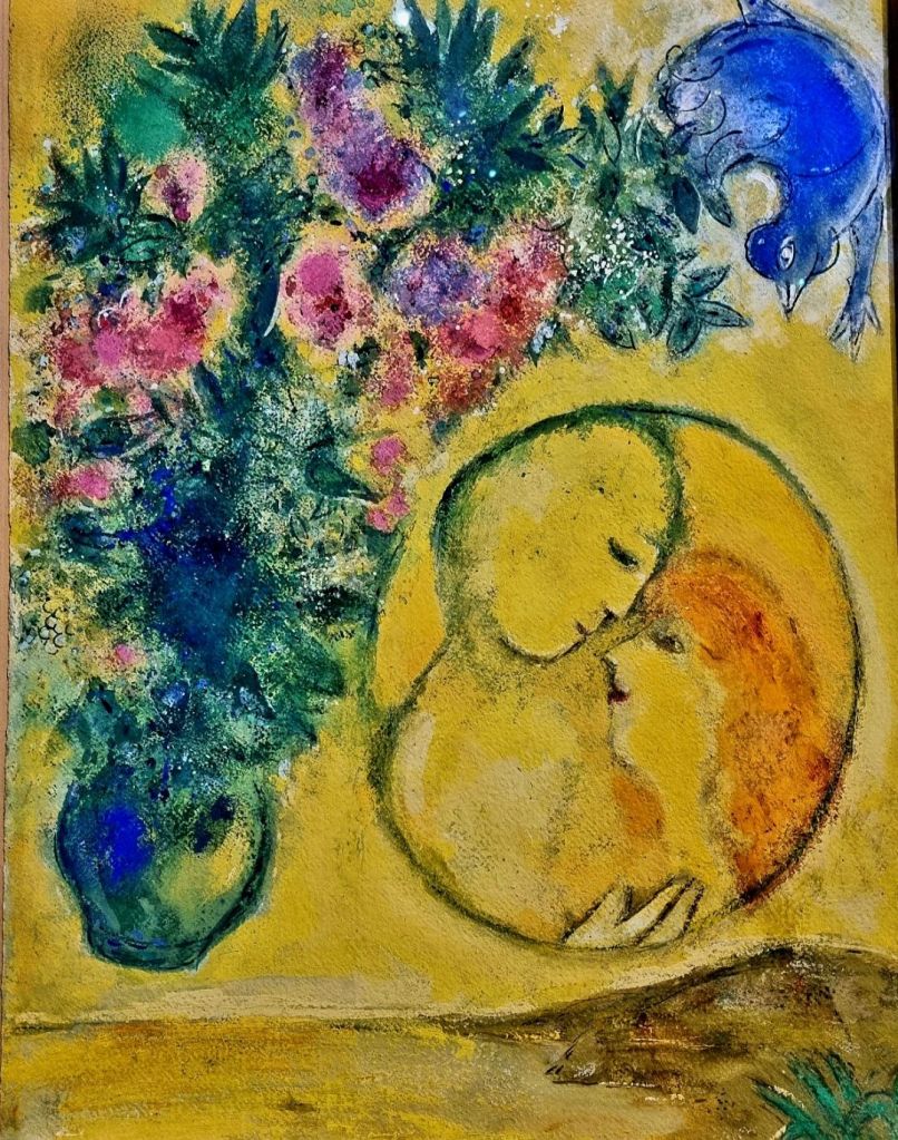 Die außerordentlich große Ausstellung zum 40. Todestag von MARC CHAGALL (1887-1985), die mich schwindelig vor Farben und Emotionen herausließ. Wahrhaftig emotional Art – kein Künstler hat, denke ich, so oft Liebespaare gemalt, von denen ich hier nur 4 aus 4 Jahrzehnten zeige, dabei hat er sie über 7 Jahrzehnte geschaffen – in der ihm eigenen, unangepassten Art, die man in keine Schublade der Schulen oder Künstlergruppen stecken kann. Gerade das gefällt mir so an Chagall. Im letzten Bild besteht sogar ein Bezug zum Osterfest: „la sainte famille“ zeigt nicht nur das eher weihnachtliche Ereignis der Geburt Jesu, sondern auch das Motiv des Kreuzes. So verbindet er in seinen späten Bildern Christentum und Judentum.19491954/55
