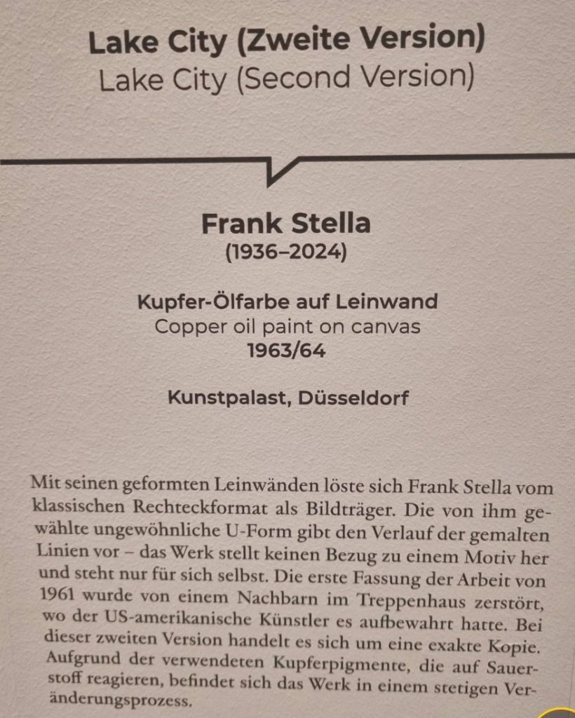 Heute vor einem Jahr genau starb der amerikanische Maler und Bildhauer FRANK STELLA (1936-2024) kurz vor seinem 88. Geburtstag. Im Kunstpalast, Düsseldorf sah ich neulich sein Bild „Lake City“ – die Geschichte dazu stand informativ daneben.