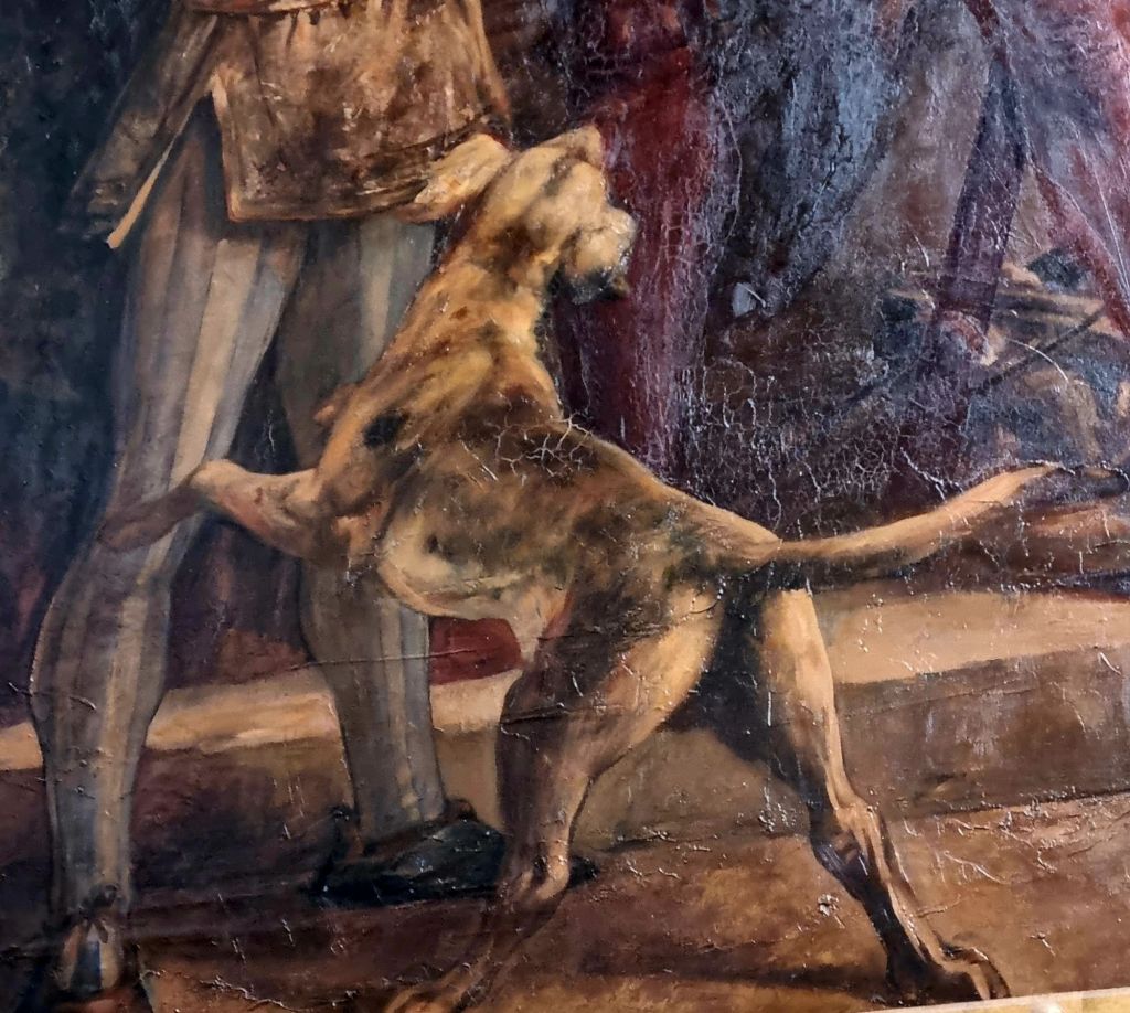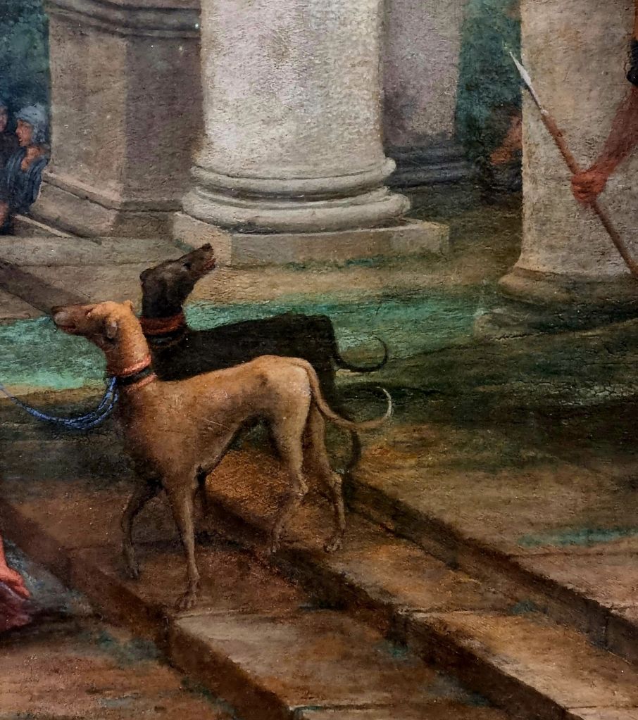 Am Welttag des Hundes müssen 3 aus dem Museum gezeigt werden – gestern sah ich in der Hamburger Kunsthalle die beiden eleganten Windhunde aus dem Pinsel von CLAUDE LORRAIN (1600-1682) und im herrlich bemalten Treppenhaus den Interessierten, vermutlich vom Auftragskünstler VALENTIN RUTHS im 19. Jahrhundert gemalt.
