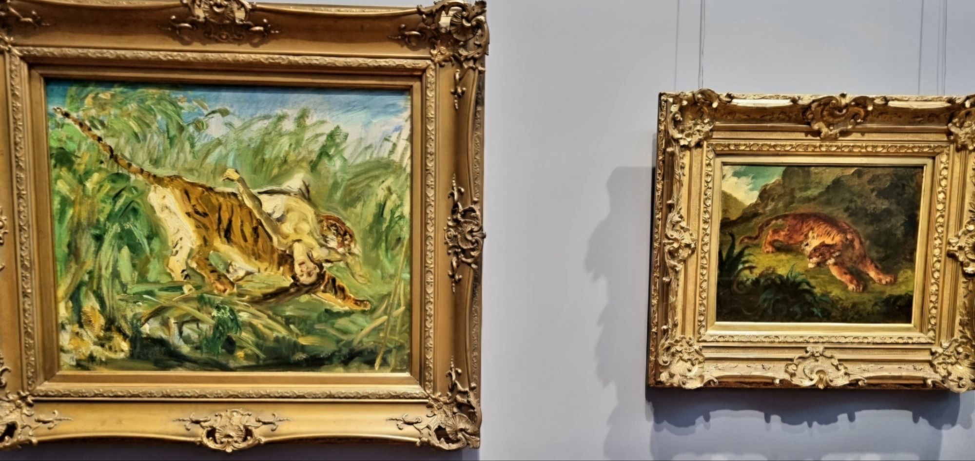 Eine inhaltlich überaus passende Hängung fiel mir neulich in der Sammlung der Hamburger Kunsthalle auf: 2 Tigerbilder nebebeinander – links das Größere von MAX SLEVOGT (1868-1932) mit dem harmlosen Titel (aber sehr dramatischen Inhalt) „Tiger im Dschungel“ von 1917 und rechts das Bild „Tiger und Schlange“, gemalt 1854 von EUGÈNE DELACROIX (1798-1863), also eine Generation vorher… beide Bilder fesselten mich, und gleichzeitig fiel der unterschiedliche Stil der beiden Künstler, die Hinwendung SLEVOGTS zur Moderne deutlich auf.