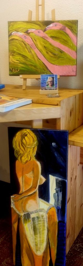 – nicht wirklich leider, sondern zu meiner großen Freude haben gestern diese beiden, zufällig untereinander positionierten YvonneWilkenPaintings eine neue Heimat gefunden. Die Hommage an Mels (Ramos) hyperrealistische Skulptur „Chiquita Banana“ mit dem von mir gewählten Titel „the Visitor“ ging an einen Besucher, meine „Flamingos“ an eine Besucherin.