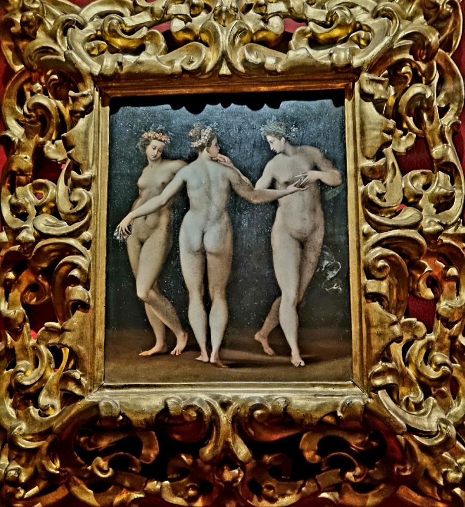 in der wunderschönen Ausstellung über die weibliche Schönheit in den Musei Reali Torino, in der ich vor etwas mehr als einer Woche war – „Da Botticelli a Mucha – la bellezza femminile“, sah ich mehrere Versionen der 3 Grazien, z. B. die hübsch gerahmte Version vom italienischen Maler FRANCESCO MORANDINI (1544-1597), die Version mit 4 Grazien vom Bildhauer aus Turin EDOARDO RUBINO (1871-1954) und die moderne plakatmäßige Version der noch lebenden italienischen Künstlerin MISETTA BOZZINI.
