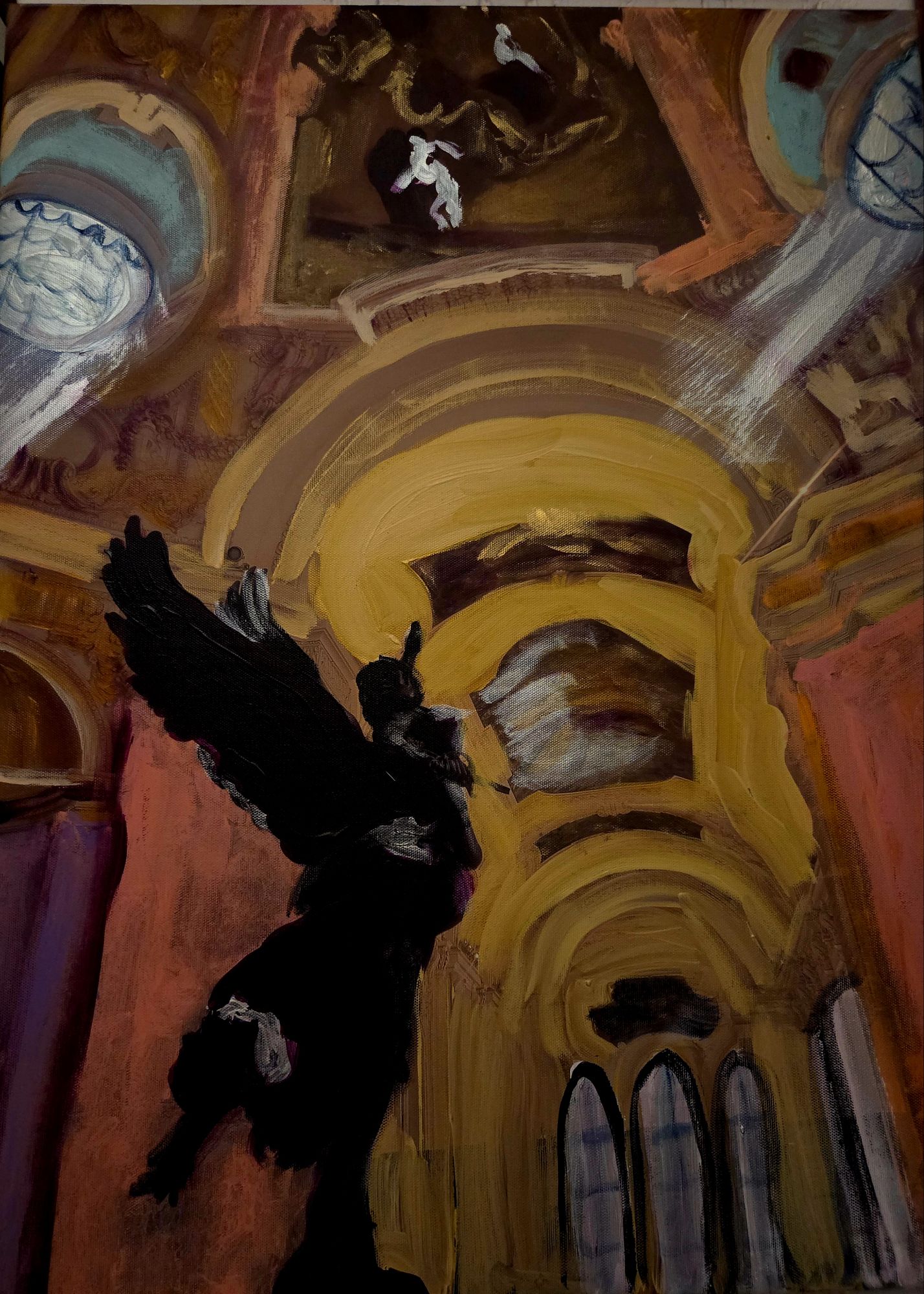 Da ich die Seinelandschaft jetzt in unserer Gemeinschaftsausstellung im alten Kaufhof von Dortmund am Westenhellweg hängen habe, bin ich froh, dass für meine heimische Wand im Musée Yvonne ein neues Parisgemälde fertig geworden ist – außer dem Musée d’Orsay mein Pariser Lieblingsmuseum und zwar der Blick ins Innere, so wie ich es im Oktober fotografiert habe: „Au musée du Petit Palais“