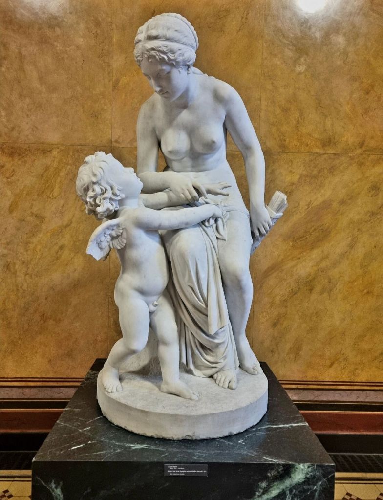 4 Artists of the day = 2 Geburtstage und 2 Todestage am 13. Januar. Herzliche Glückwünsche kann man heute der zeitgenössischen Malerin KARIN KNEFFEL sagen. Ihre großformatigen Obstbilder haben mich schon vor Jahren im Baden-Badener Burdamuseum erfreut. 2025 gefielen mir ihre „Goldenen Trauben“ von 1998 in der vielseitigen Stillleben-Ausstellung im Kunstmuseum Ahlen sehr gut: im Vergleich zur BALKENHOL- Skulptur erkennt man die Größe von KNEFFELs Format. Aber auch ein von mir sehr geschätzter Künstler der Vergangenheit hätte heute Geburtstag: CHAIM SOUTINE (1893-1943). Ich sah eines seiner Bilder mit den typischen tanzenden Landschaften – auch wenn das Bild „Arbre couché“ heißt, ist enorm viel Bewegung darin – im letzten Oktober im Musée de l’Orangerie in Paris. Da traf es sich gut, dass ich am anderen Morgen ein Gespräch mit der Dresdener-Hallenser Schriftstellerin GERTRAUDE CLEMENZ-KIRSCH führen konnte, die in der Zeit für ein Buch über SOUTINE recherchierte. Zur selben Zeit wie das Bild von SOUTINE (nämlich 1924) entstand das Bild „Ober-Reißen“ vom deutsch-amerikanischen Maler LYONEL FEININGER (1871-1956), ebenfalls mit einem sehr typischen Stil, der heute den 70. Todestag hat. Ich entdeckte es im letzten Mai im Sprengel Museum Hannover. Und als letztes ist noch der 110. Todestag vom Bildhauer JULIUS MOSER (1832-1916) zu nennen, dessen Marmorskulptur um Amor und eine Nymphe ich im Oktober in der Alten Nationalgalerie in Berlin sah.