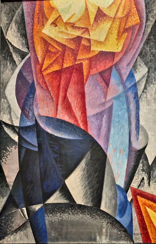 Vor genau 60 Jahren starb der von Abstraktion und Kubismus geprägte italienische Futurist GINO SEVERINI (1883-1966), der im Bild, das mir Anfang des Monats in der Staatlichen Kunsthalle Karlsruhe durch seinen ungewöhnlichen Titel auffiel, eine außergewöhnliche Gleichung aufstellte: „Tänzerin + Meer = Blumenstrauß“. Interessanterweise ist im Zentrum für mich eher ein Tier zu sehen, das dem Esel von Daumiers Bild (oder einem Stier) etwas ähnelt.