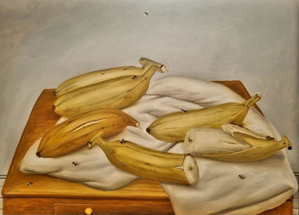 Die beiden Todestage am heutigen Sonntag betreffen zwei klassische italienische Maler, von denen einer auch einen aufmerksamen Hund gemalt hat: PAOLO VERONESE (1528-1588) und CANALETTO (ANTONIO CANAL 1697-1768)2 weitere Künstler hätten heute Geburtstag: der kolumbianische Maler FERNANDO BOTERO (1932-2023) mit einem Bananen-Stillleben (inklusive Fliegen), gesehen im Kunstmuseum Ahlen 2025, und der niederländische Videokünstler BAS JAN ADER (1942-1975), dessen Frau MARY SUE ADER ANDERSON ihn in seinen Studienjahren in Kalifornien portraitierte – gesehen in der Hamburger Kunsthalle 2025.